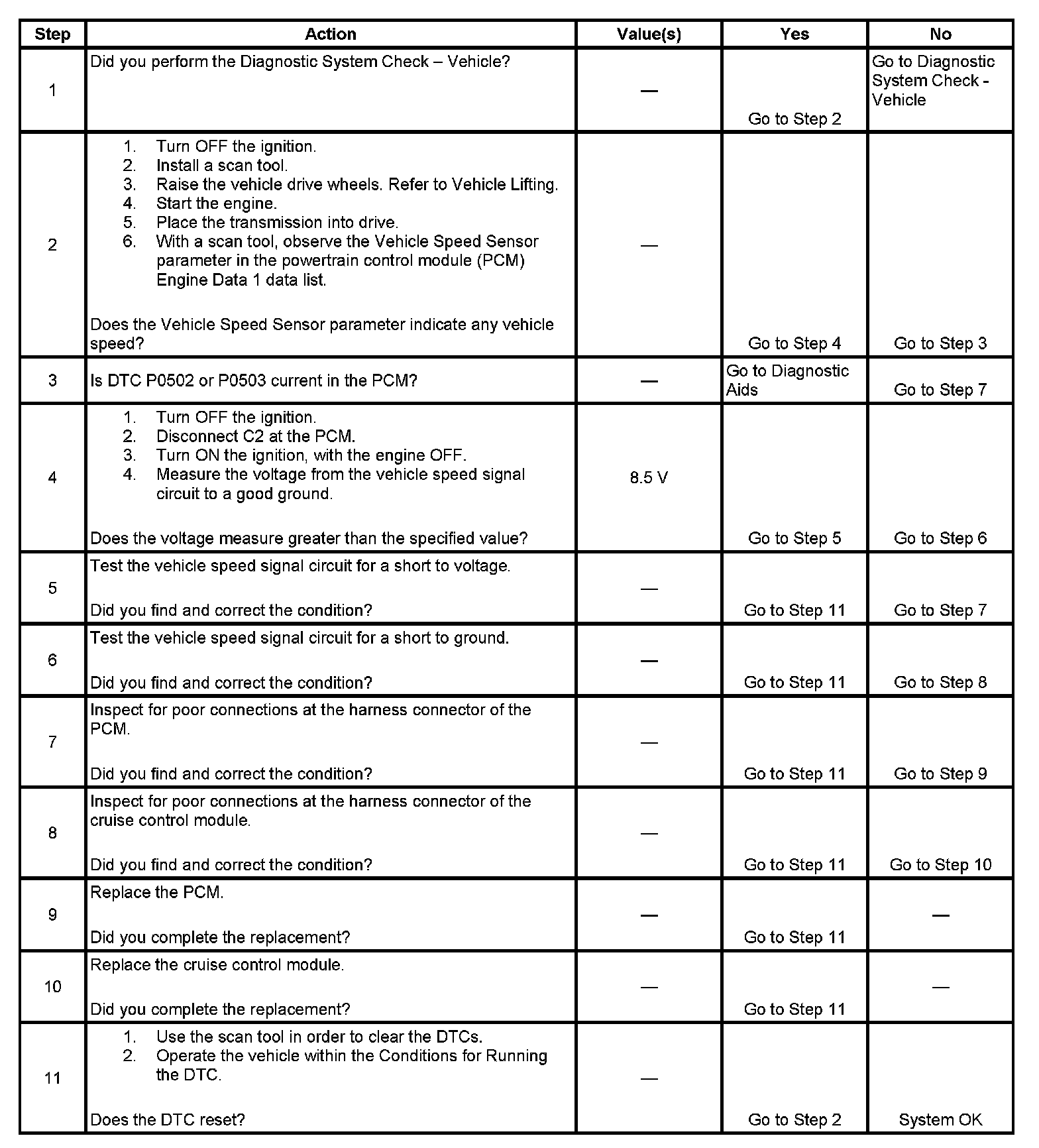 The powertrain control module (PCM) creates the vehicle speed signal by pulsing the signal circuit to ground. The PCM pulses the circuit at the same rate as the vehicle speed signal input. The PCM monitors the voltage on the vehicle speed signal circuit. If the PCM determines the voltage is out of the normal operating range, a DTC sets.