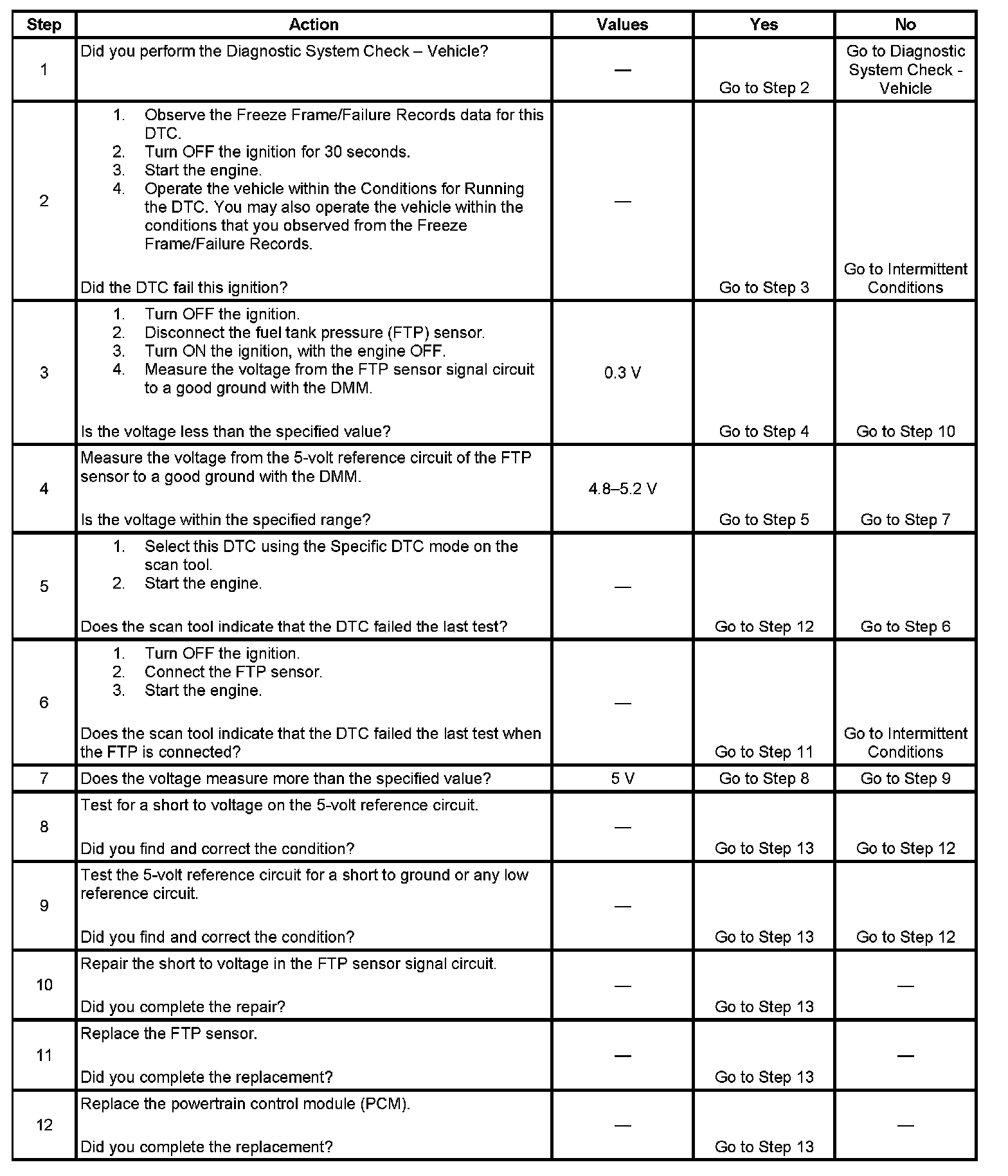 The powertrain control module (PCM) provides 5 volts to the fuel tank pressure (FTP) sensor. The PCM monitors the voltage on the 5-volt reference circuit. If the voltage is out of tolerance, DTC P0651 sets.