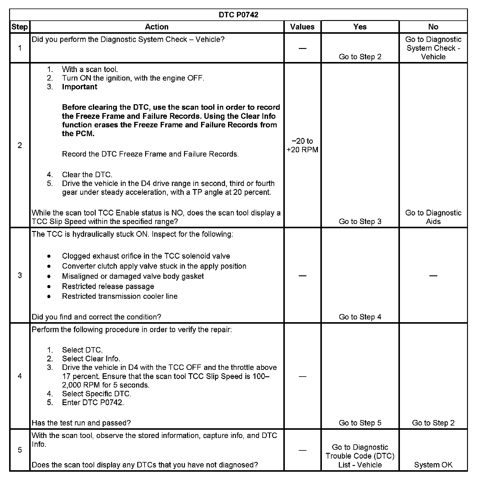 When the PCM detects low TCC slip speed when the TCC is commanded OFF, then DTC P0742 sets. DTC P0742 is a type B DTC.