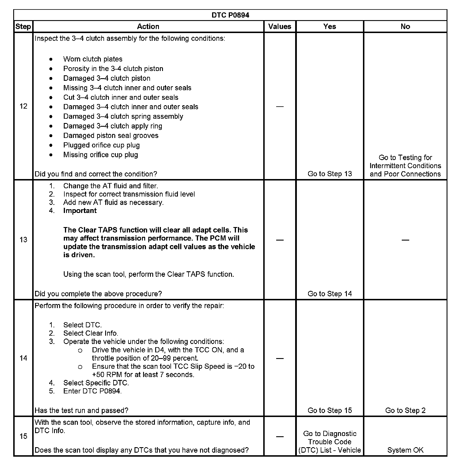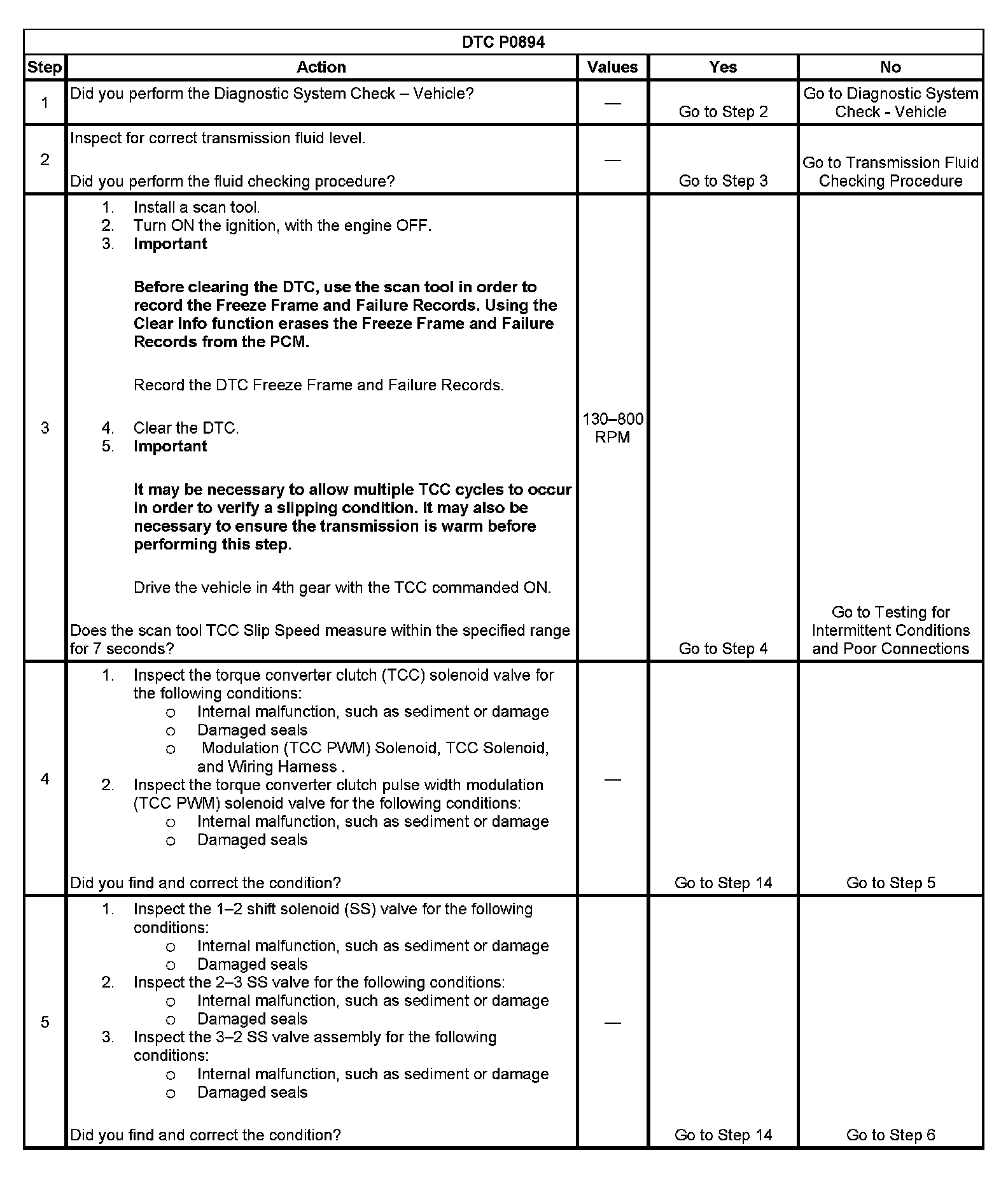 When the PCM detects excessive TCC slip when the TCC should be engaged, then DTC P0894 sets. DTC P0894 is a type B DTC.