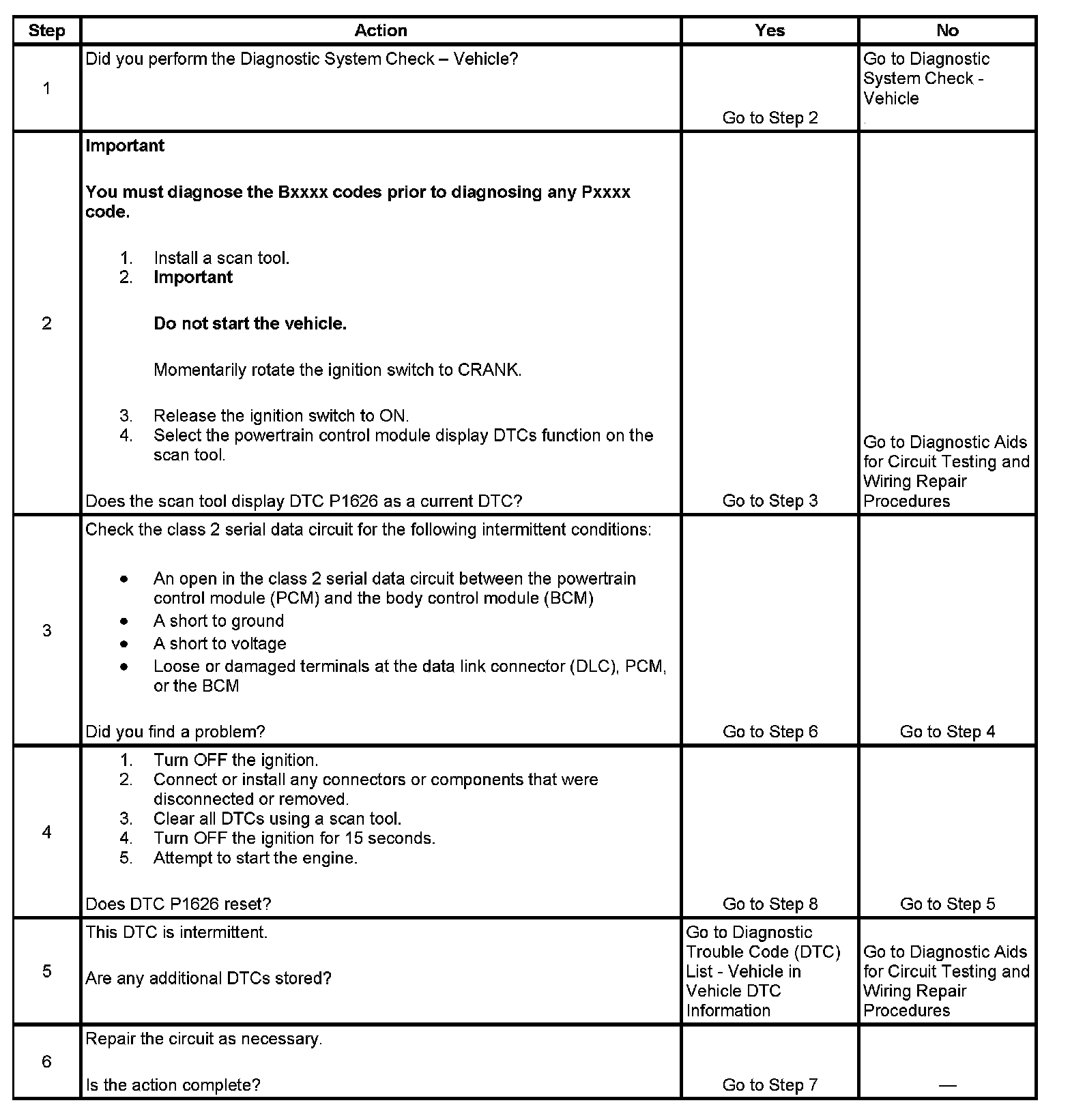 - If the class 2 serial data circuit is shorted to ground or shorted to voltage, then all systems connected to the serial data circuit will not be able to communicate properly. Systems capable of storing loss of communications DTCs, or the DTCs with the letter "U" as a prefix, will have these codes stored in their memory. If a DTC U1192 is stored in the PCM memory along with the P1626, then a fault occurred at some point after the PCM received the correct password. The BCM must also be inspected for intermittent operation due to a loss of power or ground to the module itself. After repairing the cause of DTC 1626, clear all DTCs from the systems capable of storing this DTC and DTC U1192.
