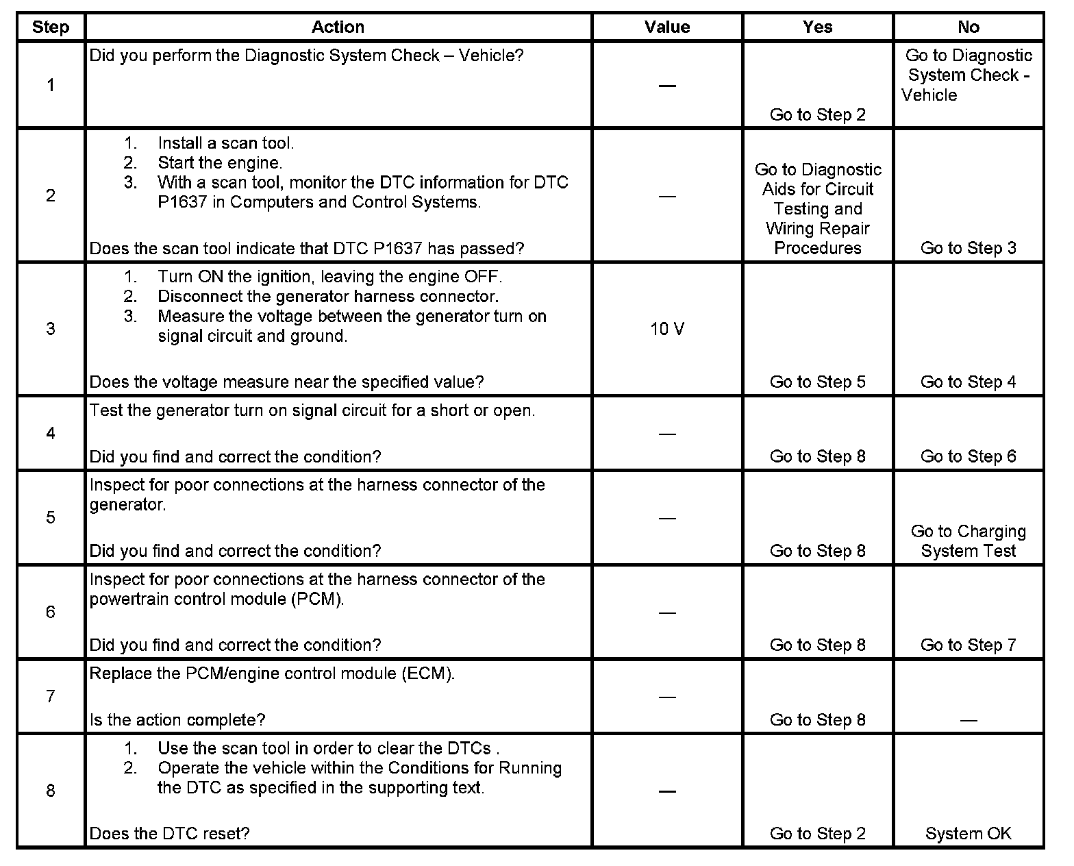 The powertrain control module (PCM) uses the generator turn on signal circuit to control the generator. A high side driver within the PCM allows the PCM to turn the generator ON and OFF. When generator operation is desired, the PCM sends a 5-volt signal to the voltage regulator via the generator turn on signal circuit. This causes the voltage regulator to begin controlling the generator field circuit. Once the generator is enabled by the PCM, the voltage regulator controls generator output independently of the PCM. Under certain operating conditions, the PCM can turn Off the generator by turning OFF the 10-volt signal on the generator turn on signal circuit. The PCM has fault detection circuitry which monitors the state of the generator turn on signal circuit. If the fault detection circuit senses a voltage other than what is expected, this DTC will set. The voltage regulator also contains fault detection circuitry. If the regulator detects a problem, the regulator will ground the generator turn on signal circuit, pulling the voltage low. This also causes the PCM to set the DTC.