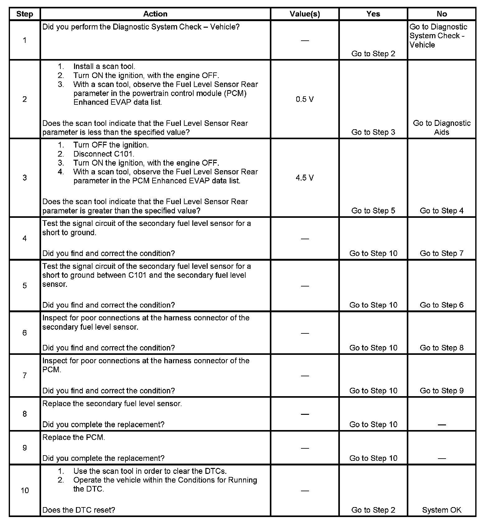 - The secondary fuel level signal is less than 0.5 volts.