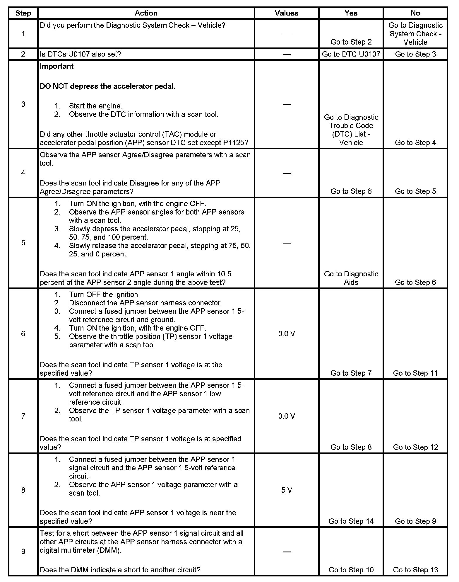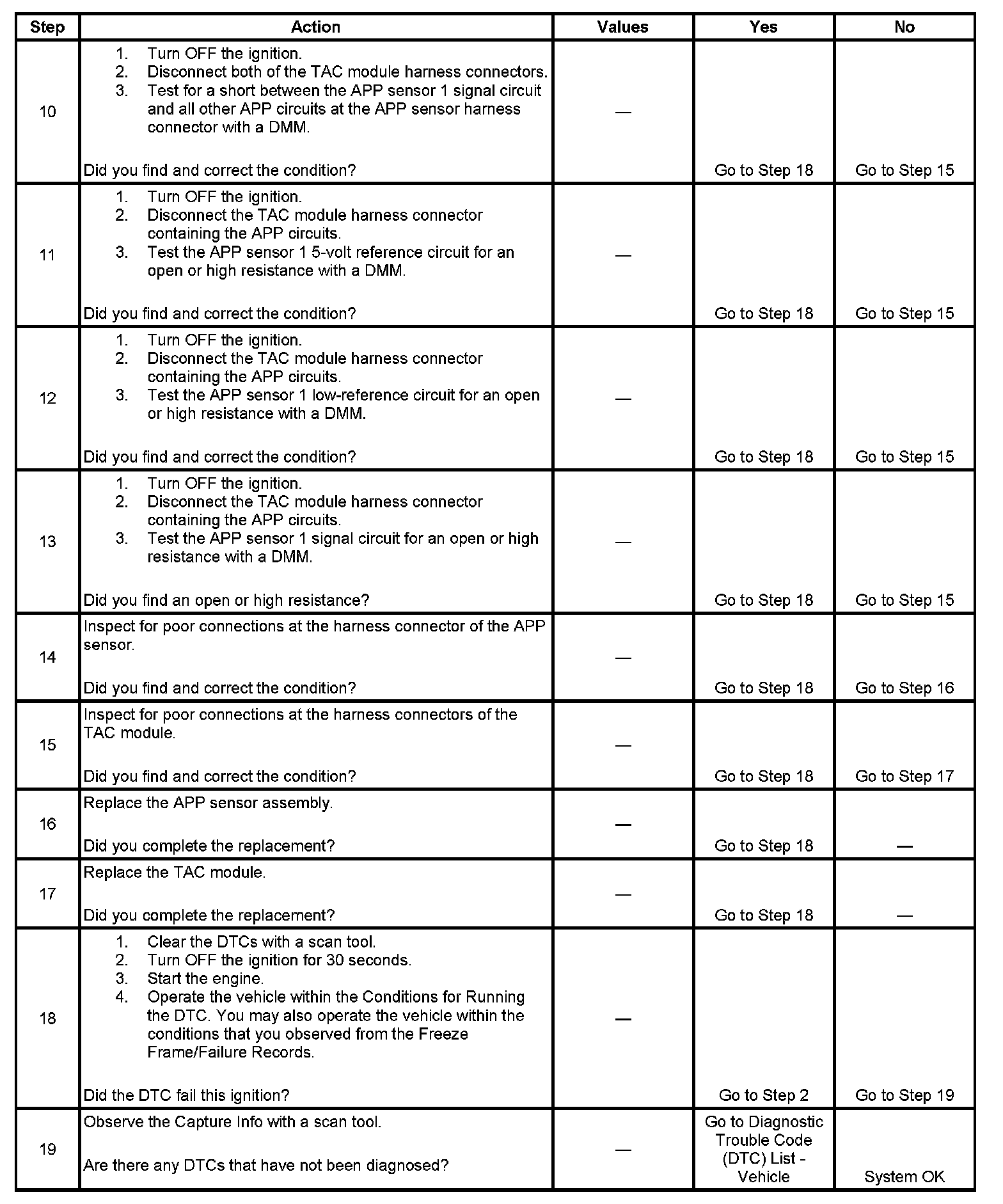 5. This step isolates an internal APP sensor failure. The condition may only occur at a certain accelerator pedal position. Monitoring the APP angles for sensor 2 and sensor 3 is an accurate way of verifying the actual position of the pedal. The APP angles for all 3 sensors should be within a few percent of each other. If the pedal is at rest, the APP angle for all 3 sensors should be 0 percent. If the pedal is fully depressed, all APP angles should be 100 percent.