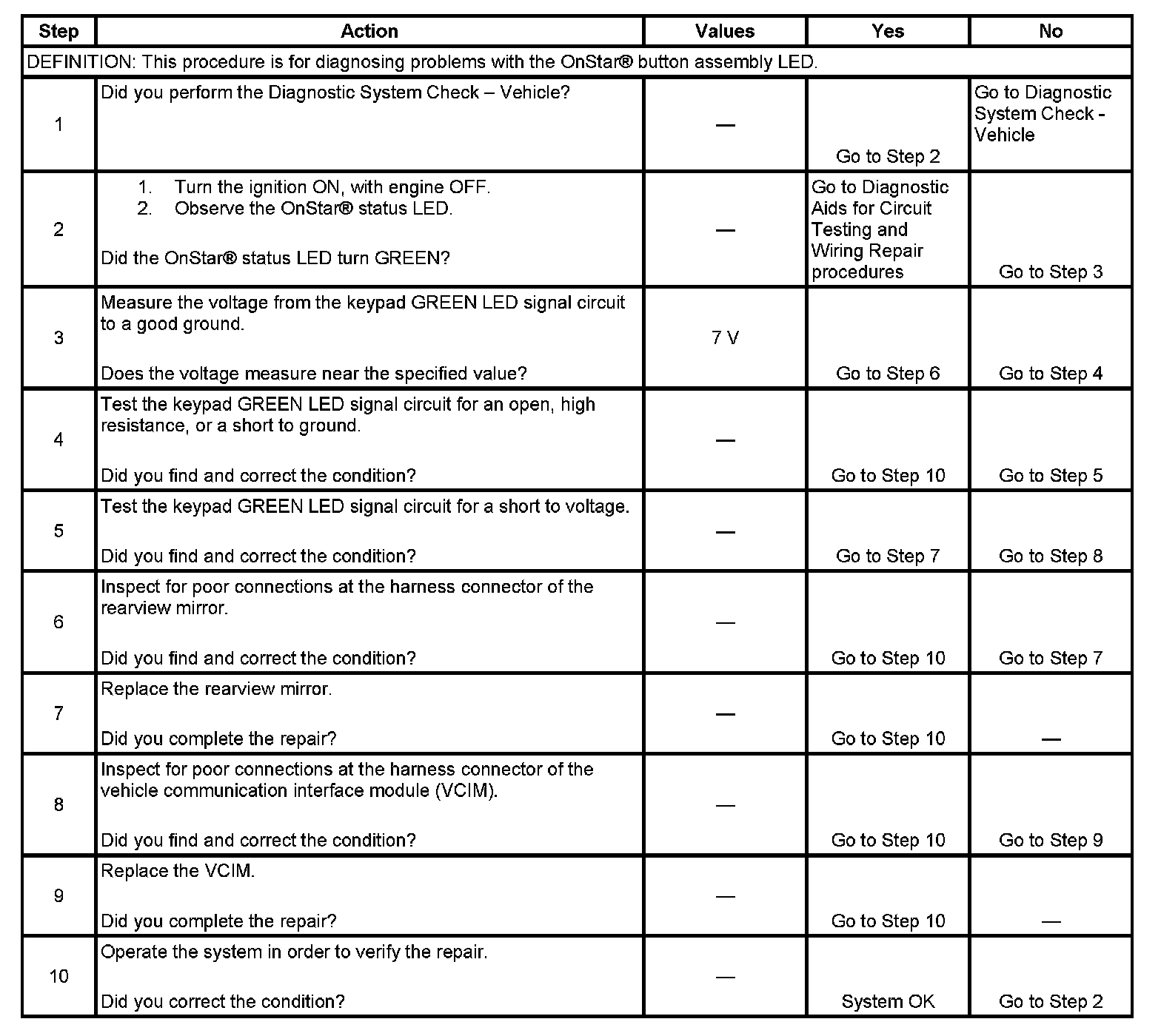 5. If the GREEN LED signal is shorted to voltage, then the OnStar(R) 3-button assembly has been damaged and must be replaced.