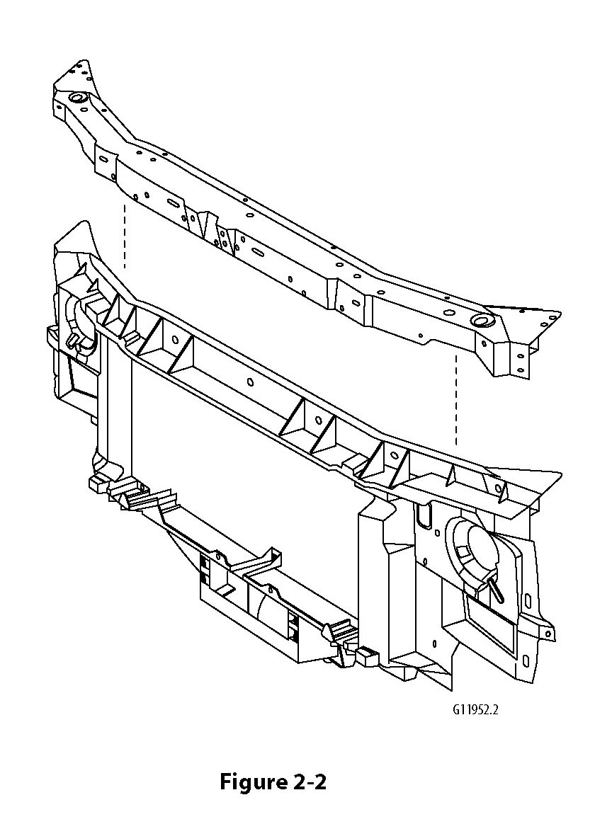 The radiator support assembly is made of a composite material (SMC) to reduce weight and simplify installation procedures. The radiator support bolts on and is positioned by tabs which are located into holes in the front-end lower tie bar (figure 2-1). A steel reinforcement extends across the upper portion. This reinforcement is part of the assembly or available separately (figure 2-2). It is attached to the radiator support by 14 rivets. Replacement rivets are available as GM Part #10263118.
