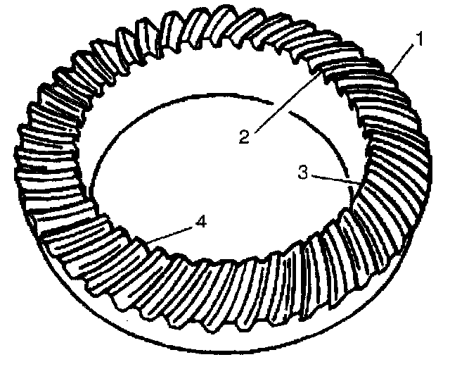 The side of the ring gear tooth which curves outward, or is convex, is the drive side (4). The concave side is the coast side (3). The end of the tooth nearest the center of the ring gear is the toe end (2). The end of the tooth farthest away from the center is the heel end (1).