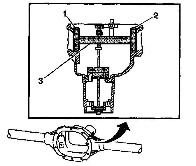 6. Assemble the J21777-45 (1, 2) to the J21777-1 (3) into the differential side bearing bore of the axle housing as shown.