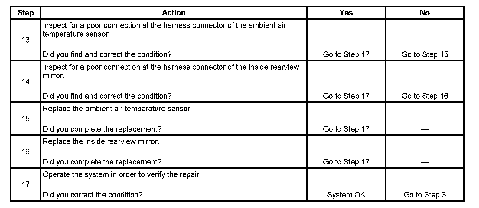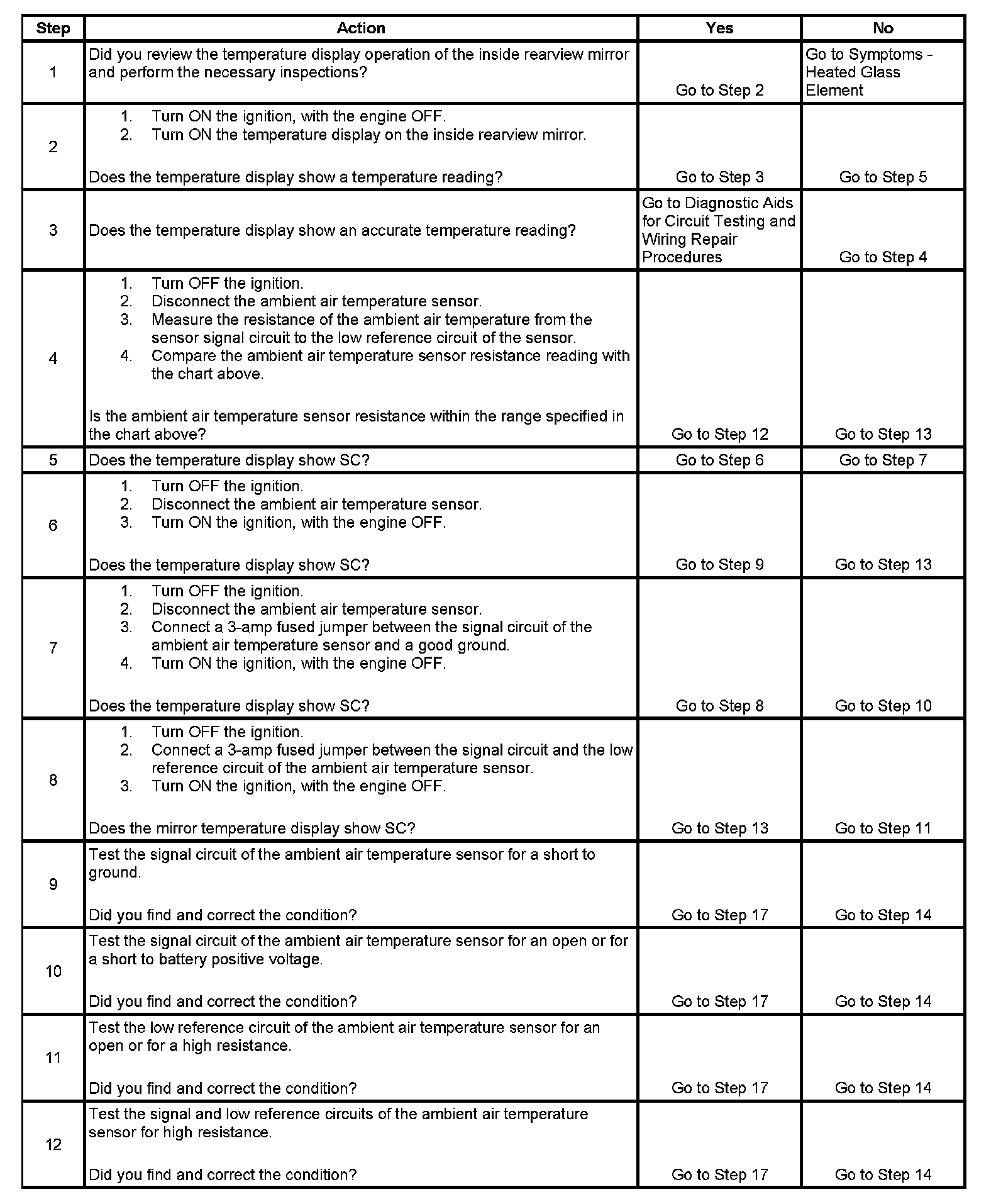 The table will be used to measure the resistance of the sensor and compare it with the actual ambient temperature. The mirrors temperature accuracy should be within 5 degrees of the actual temperature. The actual temperature should not be taken from a radio station, a sign displaying the temperature, etc. A temperature measuring tool such as a thermometer should be used. Some temperature measuring tools may be within 5 degrees of the actual temperature. Make sure to consult the manufacturer for the accuracy of the tool. This comparison can make the mirror seem off by 5-10 degrees of the actual temperature when it is not.