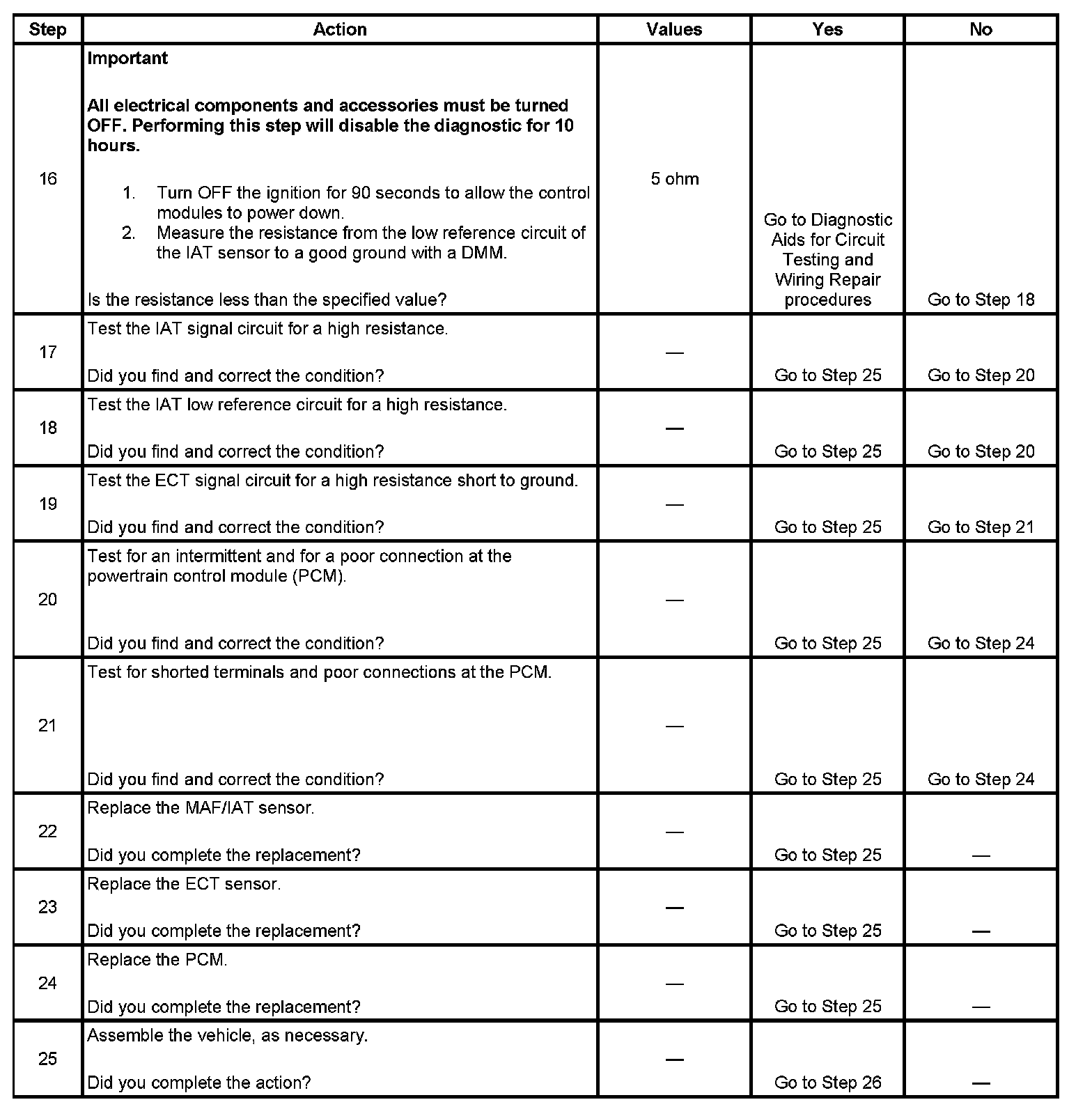 The numbers below refer to the step numbers on the diagnostic table.