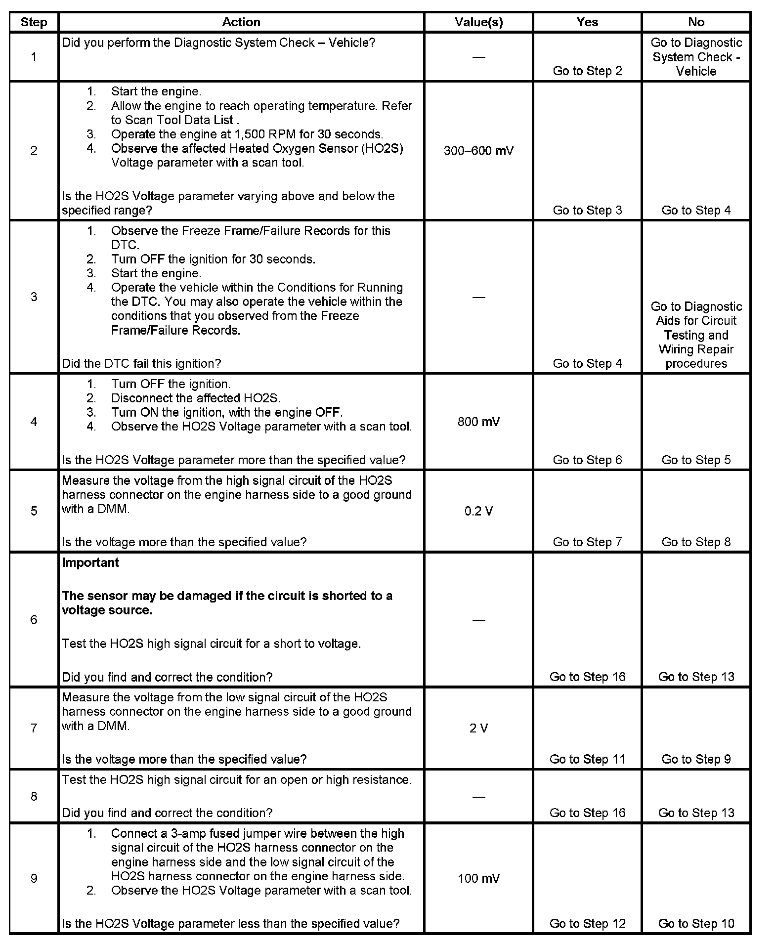 Heated oxygen sensors (HO2S) are used for fuel control and post catalyst monitoring. Each HO2S compares the oxygen content of the surrounding air with the oxygen content in the exhaust stream. The HO2S must reach operating temperature to provide an accurate voltage signal. Heating elements inside the HO2S minimize the time required for the sensors to reach operating temperature. The powertrain control module (PCM) supplies the HO2S with a reference, or bias, voltage of about 450 mV. When the engine is first started the PCM operates in Open Loop, ignoring the HO2S voltage signal. Once the HO2S reaches operating temperature and Closed Loop is achieved, the HO2S generates a voltage within a range of 0-1,000 mV that fluctuates above and below bias voltage. High HO2S voltage indicates a rich exhaust stream. Low HO2S voltage indicates a lean exhaust stream. If the PCM detects that the HO2S voltage remains within the bias voltage range, DTC P0134 sets for HO2S bank 1 sensor 1, or P0154 sets for HO2S bank 2 sensor 1.