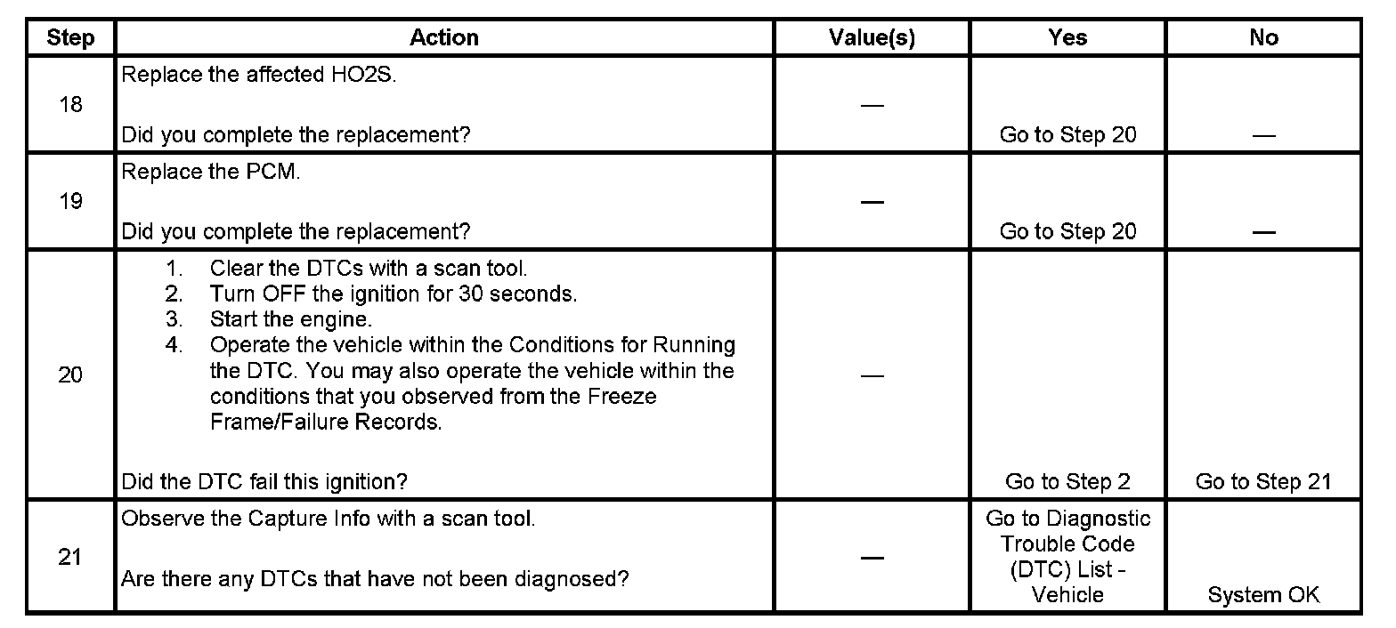 Heated oxygen sensors (HO2S) are used for fuel control and post catalyst monitoring. Each HO2S compares the oxygen content of the surrounding air with the oxygen content in the exhaust stream. The HO2S must reach operating temperature to provide an accurate voltage signal. Heating elements inside the HO2S minimize the time required for the sensors to reach operating temperature. The powertrain control module (PCM) supplies the HO2S with a reference, or bias, voltage of about 450 mV. When the engine is first started the PCM operates in Open Loop, ignoring the HO2S voltage signal. Once the HO2S reaches operating temperature and Closed Loop is achieved, the HO2S generates a voltage within a range of 0-1,000 mV that fluctuates above and below bias voltage. High HO2S voltage indicates a rich exhaust stream. Low HO2S voltage indicates a lean exhaust stream. If the PCM detects an HO2S voltage that stays below a specified value, DTC P0137 sets for HO2S bank 1 sensor 2, or DTC P0157 sets for HO2S bank 2 sensor 2.
