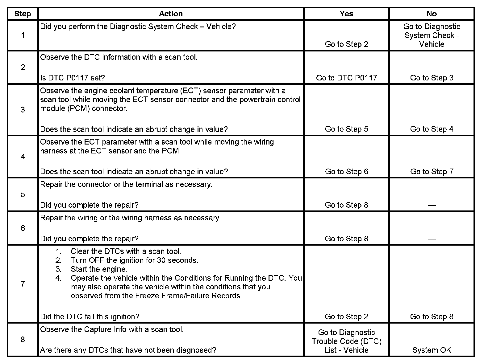 The engine coolant temperature (ECT) sensor is a variable resistor, that measures the temperature of the engine coolant. The powertrain control module (PCM) supplies 5 volts to the ECT signal circuit and a ground for the ECT low reference circuit. When the ECT is cold, the sensor resistance is high. When the ECT increases, the sensor resistance decreases. With high sensor resistance, the PCM detects a high voltage on the ECT signal circuit. With lower sensor resistance, the PCM detects a lower voltage on the ECT signal circuit. If the PCM detects an excessively low ECT signal voltage, which is a high temperature indication, DTC P1114 sets.