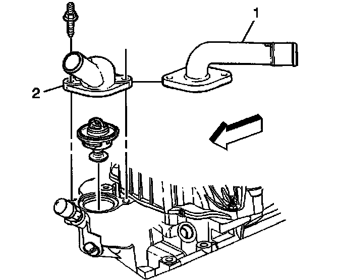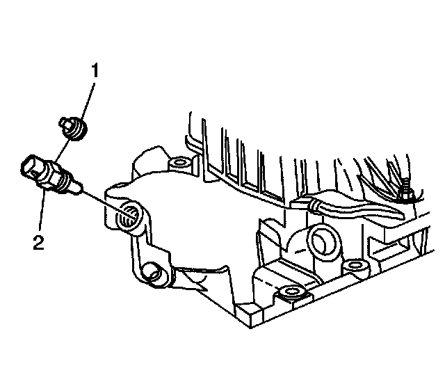 27. If reusing the engine coolant temperature (ECT) sensor plug (1) or the ECT sensor (2), if equipped, apply sealant GM P/N 12346004 (Canadian P/N 10953480) or equivalent, to the threads of the ECT sensor plug (1) or the ECT sensor (2).