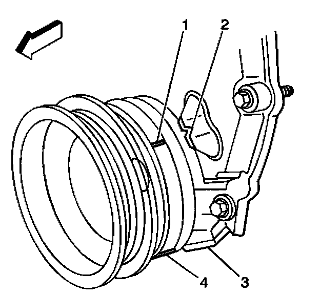 Distributor InstallationImportant: The engine front cover has 2 alignment tabs and the crankshaft balancer has 2 alignment marks (spaced 90 degrees apart) which are used for positioning number 1 piston at top dead center (TDC). With the piston on the compression stroke and at top dead center, the crankshaft balancer alignment mark (1) must align with the engine front cover tab (2) and the crankshaft balancer alignment mark (4) must align with the engine front cover tab (3).