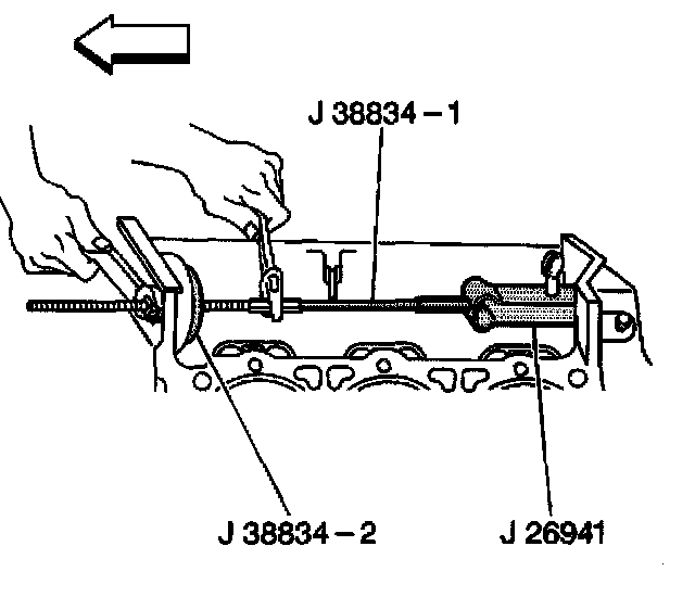 2.2. Install the J 38834-1 with the short threaded end through the balance shaft bole in the front of the engine block.