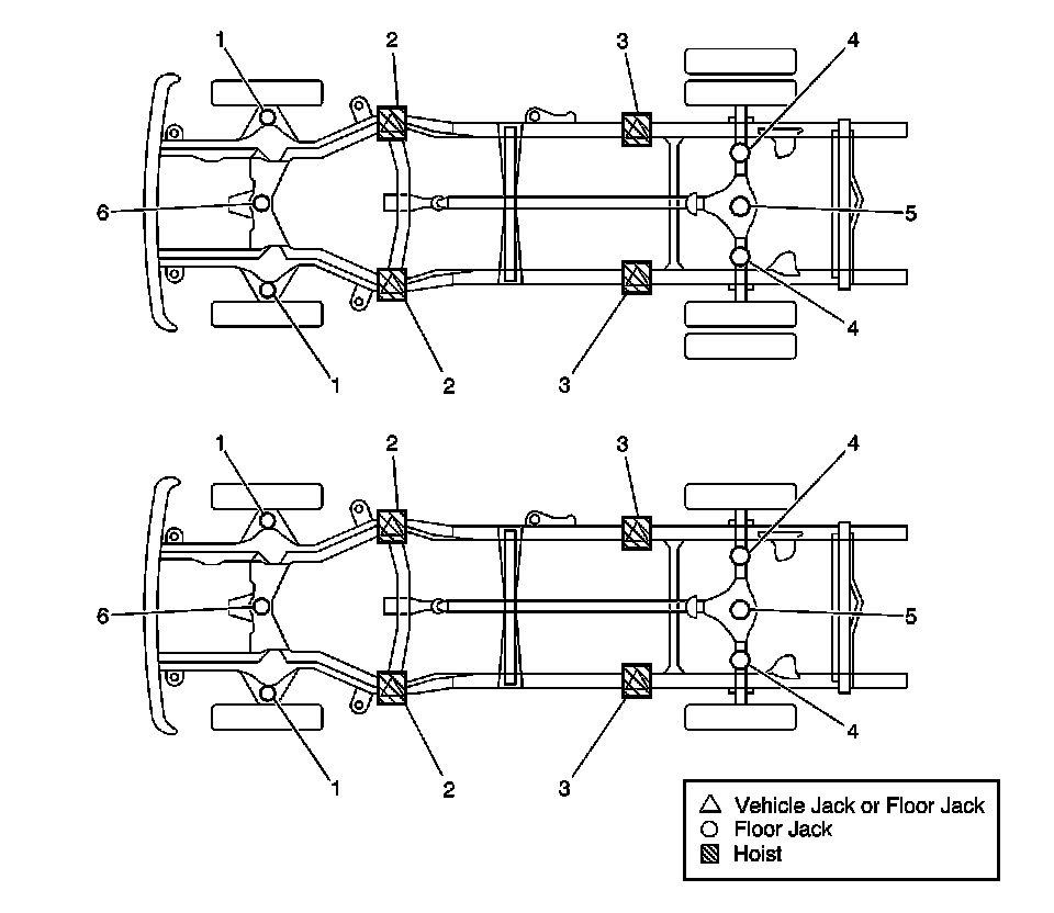 Caution: To avoid any vehicle damage, serious personal injury or death when major components are removed from the vehicle and the vehicle is supported by a hoist, support the vehicle with jack stands at the opposite end from which the components are being removed.