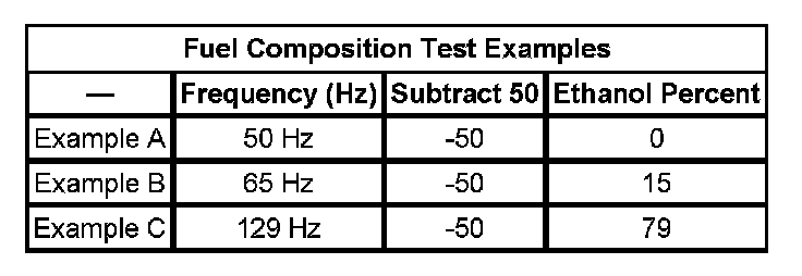 3. Subtract 50 from the reading on the DMM in order to obtain the percentage of alcohol in the fuel sample. Refer to the examples in the Fuel Composition Test Examples table.