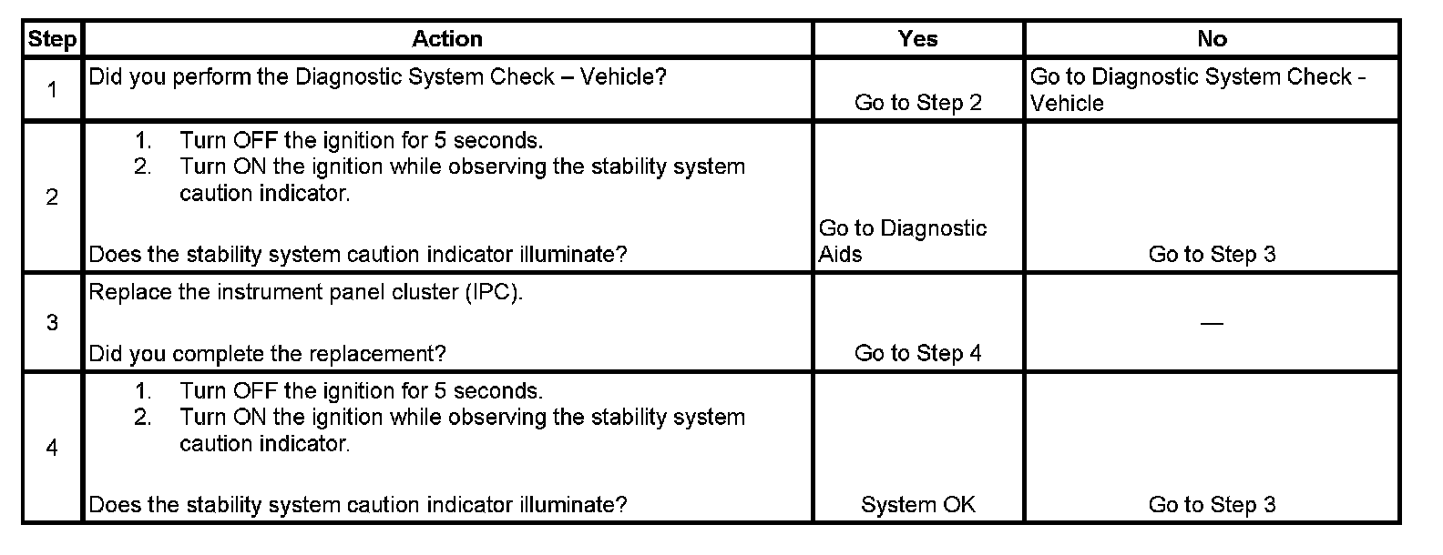 The instrument panel cluster (IPC) illuminates the stability system caution indicator during the IPC bulb check or when the electronic brake control module (EBCM) sends a serial data message to the IPC commanding the indicator ON.