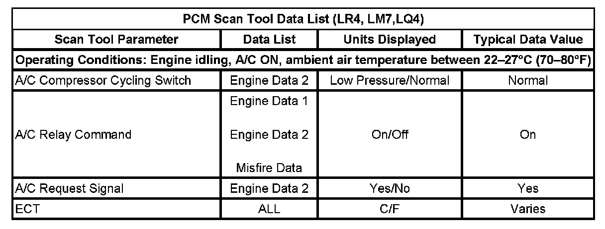 Use the Scan Tool Data Display Values and Definitions Information in order to assist in diagnosing the Powertrain Control Module (PCM) problems. Compare the vehicles actual scan tool data with the typical data display value table information. Use the data information in order to aid in understanding the nature of the problem when the vehicle does not match with the typical data display values.