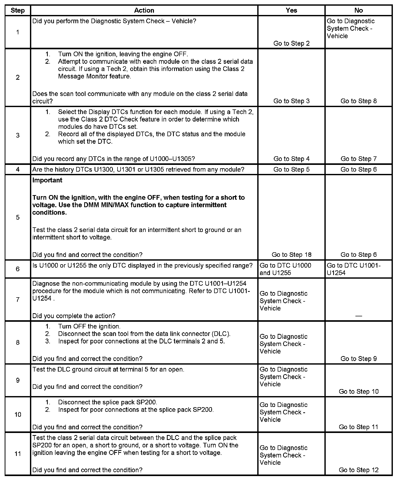 11. An open in the class 2 serial data circuit between the DLC and splice pack SP200 will prevent the scan tool from communicating with any module. This condition will not set a DTC.