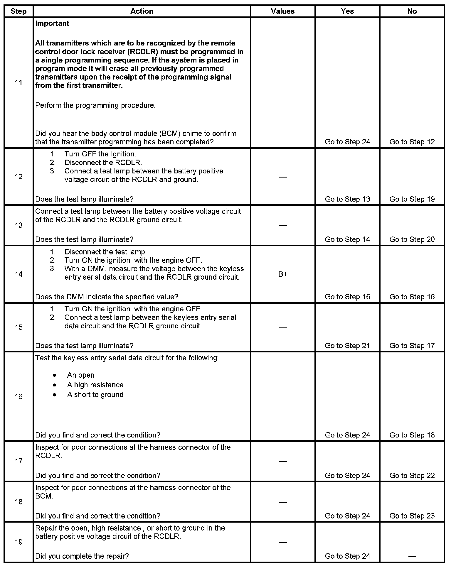 15. An illuminated test lamp at step 16 reveals a short to voltage in the serial data circuit.