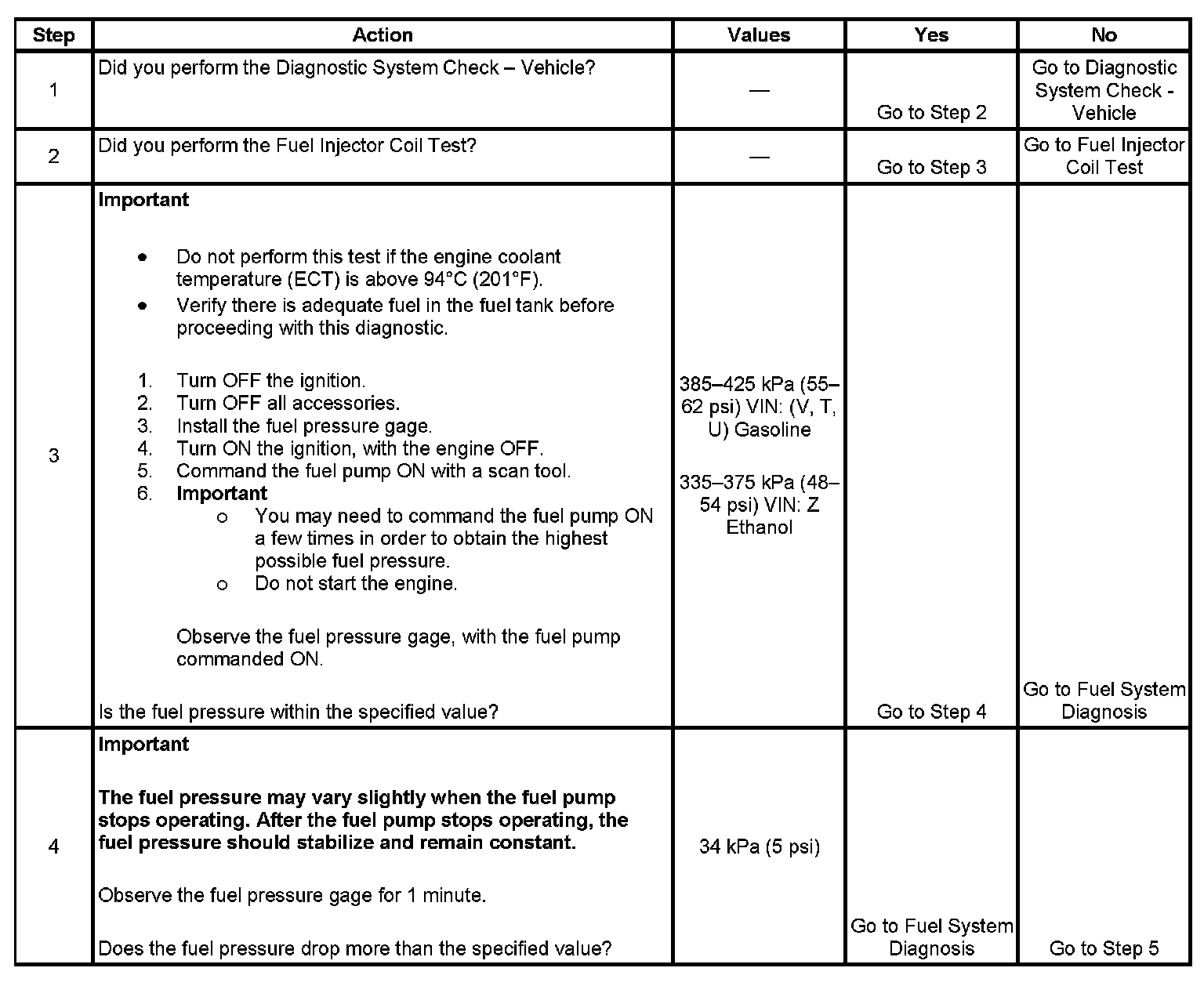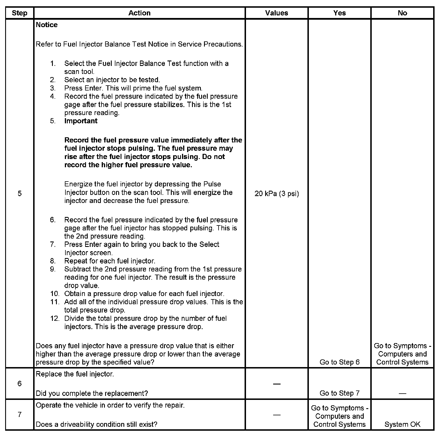 5. If the pressure drop value for each fuel injector is within 10 kPa (1.5 psi) of the average pressure drop value, the fuel injectors are flowing properly. Calculate the pressure drop value for each fuel injector by subtracting the second pressure reading from the first pressure reading.