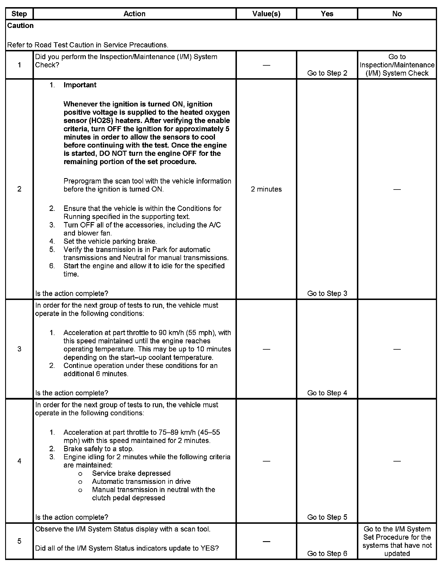 The scan tool can be used in order to monitor each of the I/M system status indicators during the I/M Complete System Set Procedure. When all of the indicators for a test step have updated to YES, testing can move on to the next step even if the remaining portion of the test is not complete. For example, step 3 is designed to run the EVAP, secondary air injection (AIR), and HO2S tests. The procedure instructs the technician to operate the vehicle in the enable conditions for 6 minutes. If all 3 tests have updated to YES within 4 minutes, you do not need to continue with the enable conditions and testing can advance to the next step.