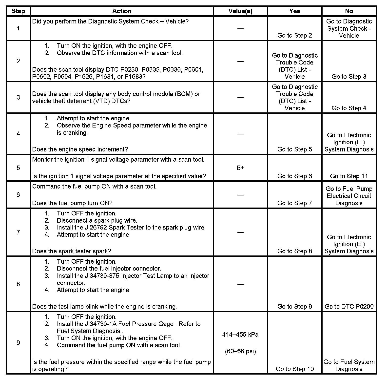 The Engine Cranks but Does Not Run diagnostic table assumes the following: