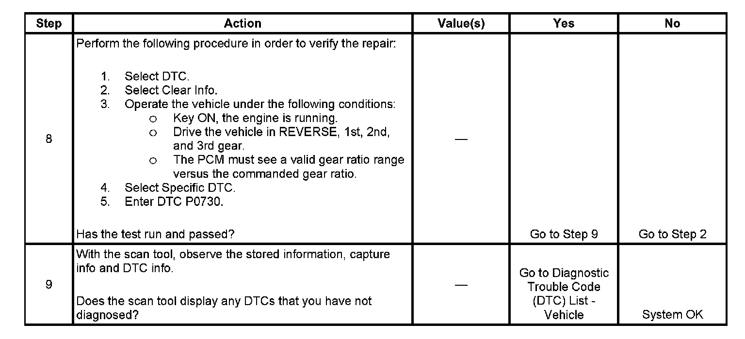 If the PCM detects an unknown transmission gear ratio, then DTC P0730 sets. DTC P0730 is a type C DTC.