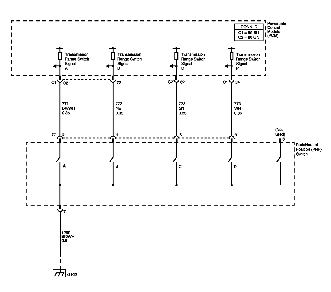 Refer to Transmission Range Switch Logic for valid combinations of switch signal circuits A, B, C and Parity. On the table, HI indicates an ignition voltage signal. LOW indicates a zero voltage signal.