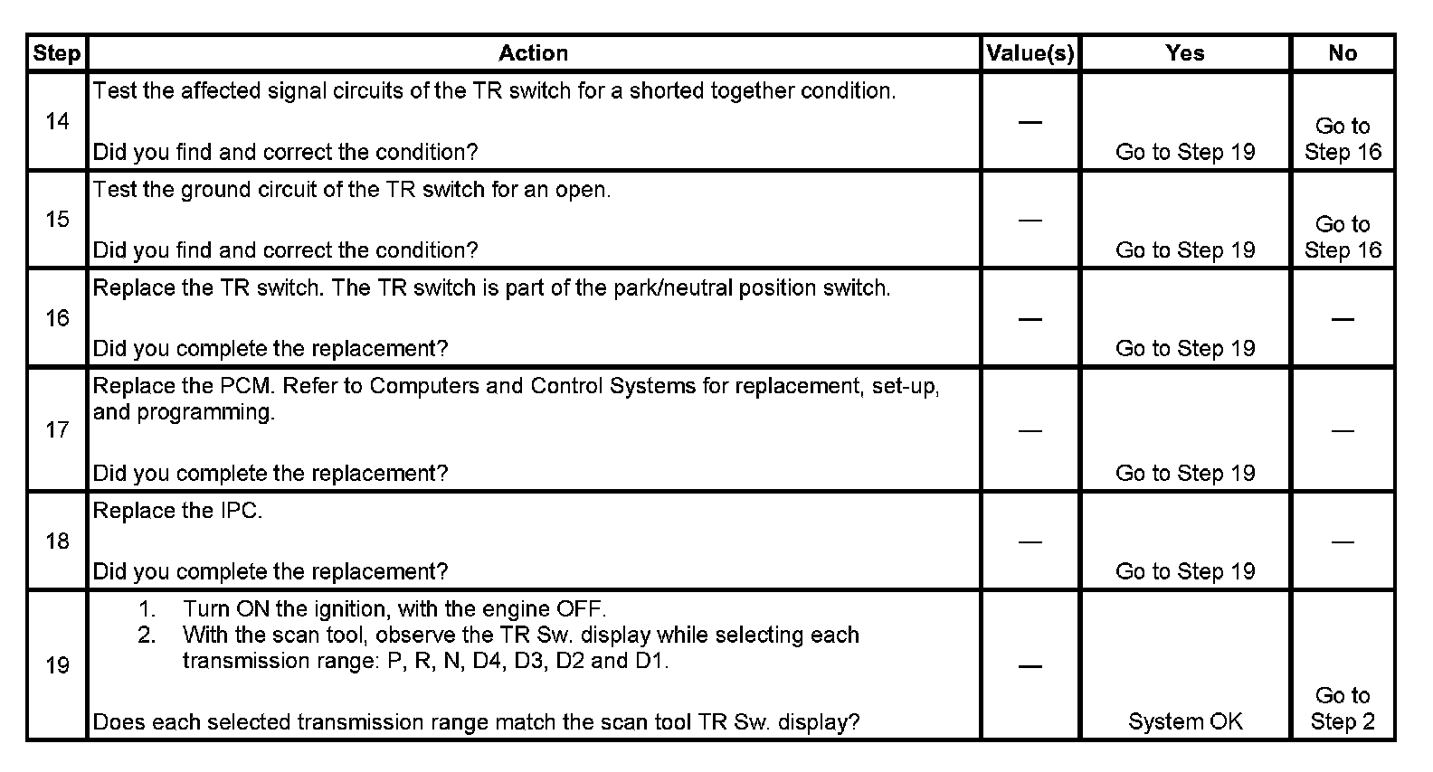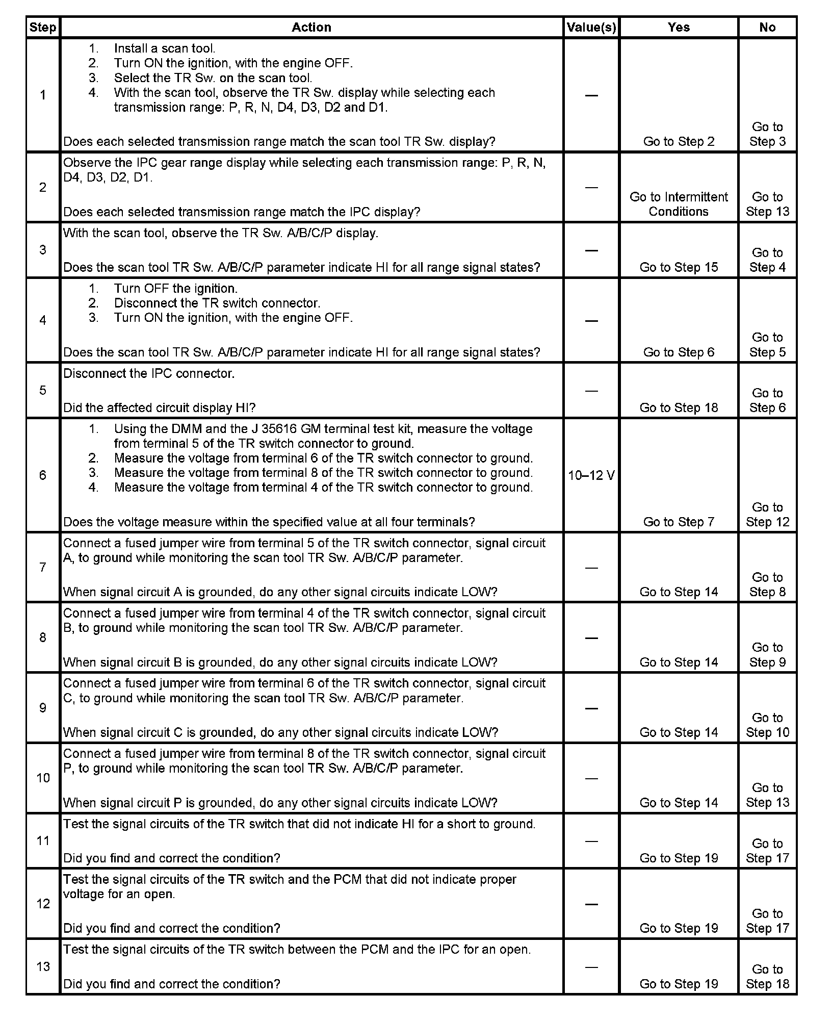 6. This step tests the TR switch wiring for an open or the lack of the signal voltage from the PCM.