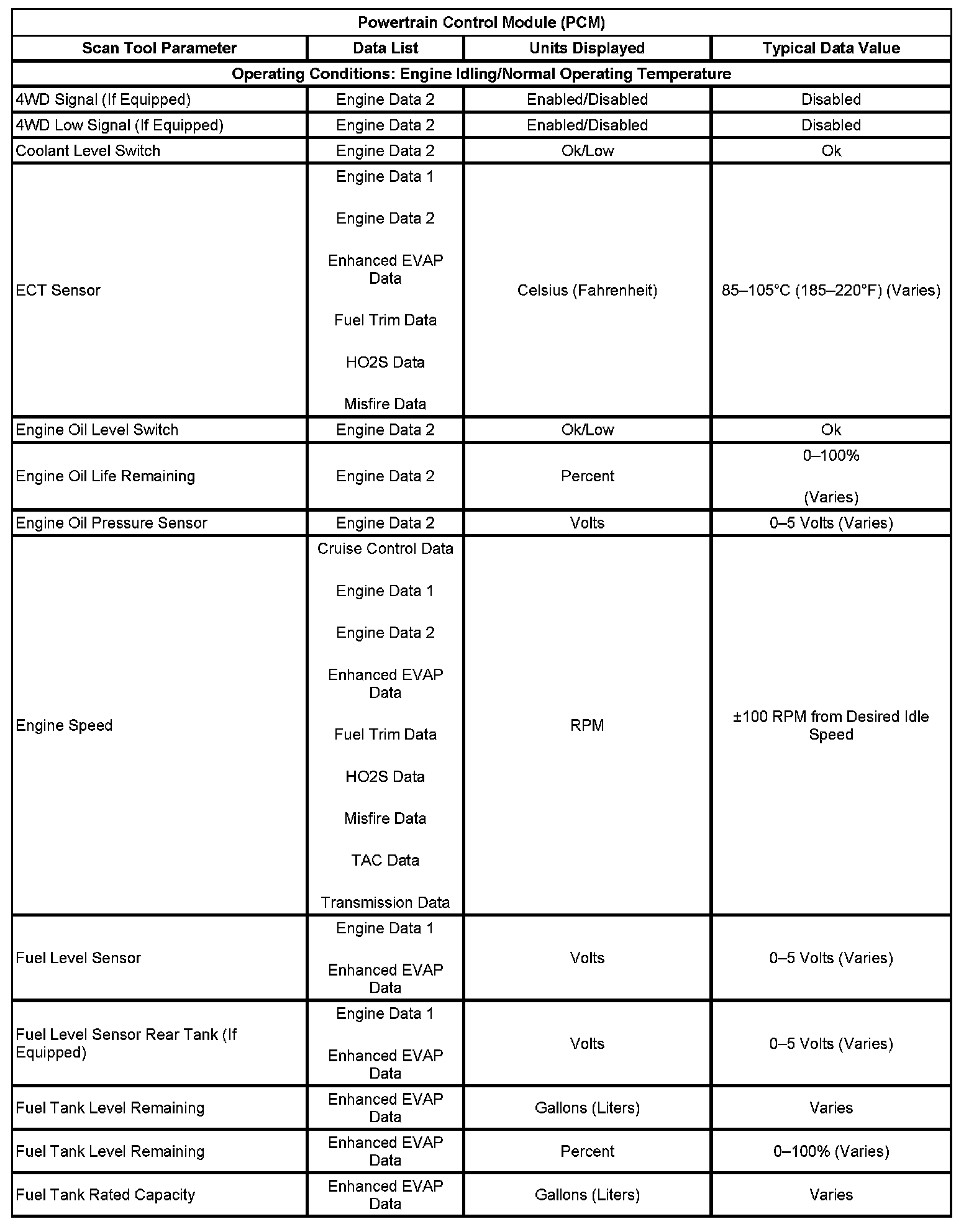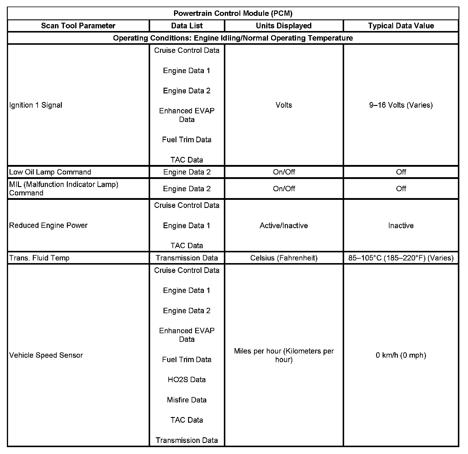 Scan Tool Data List - Powertrain Control Module (PCM)