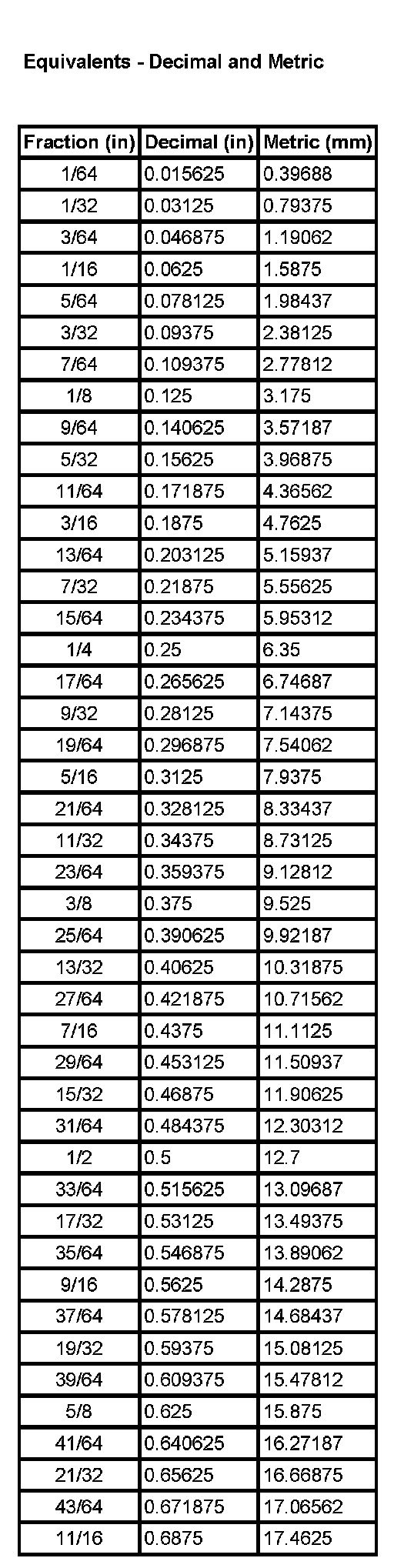 Equivalents - Decimal And Metric
