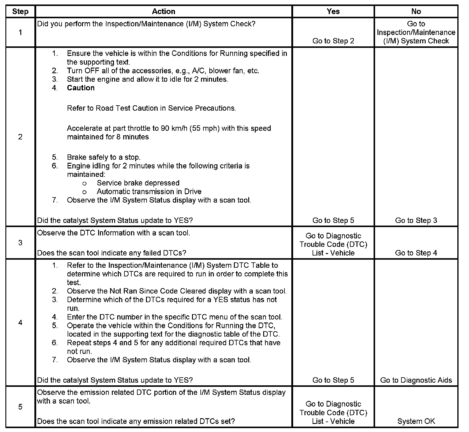 The purpose of this test is to satisfy the enable criteria necessary to execute inspection/maintenance (I/M) readiness diagnostics for the catalyst system. The test may be used to set the I/M System Status indicators to YES. The I/M System Status display on the scan tool provides an indication of whether the control module has completed the required tests. The I/M System Status does not indicate that the tests have passed or failed. When all of the diagnostics for a specific system have run and passed, the I/M System Status will update to YES. If a test for a specific system has failed, the I/M System Status will update to YES, indicating a determination was made even if all of the other tests for that system have not run.