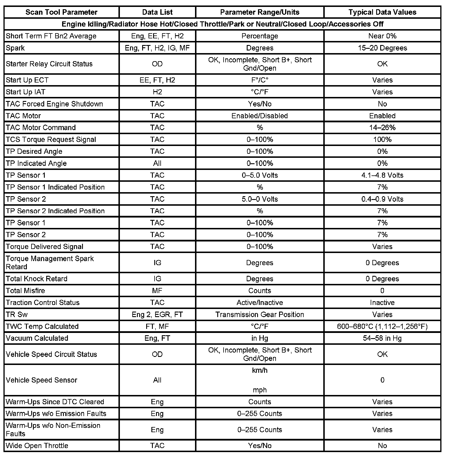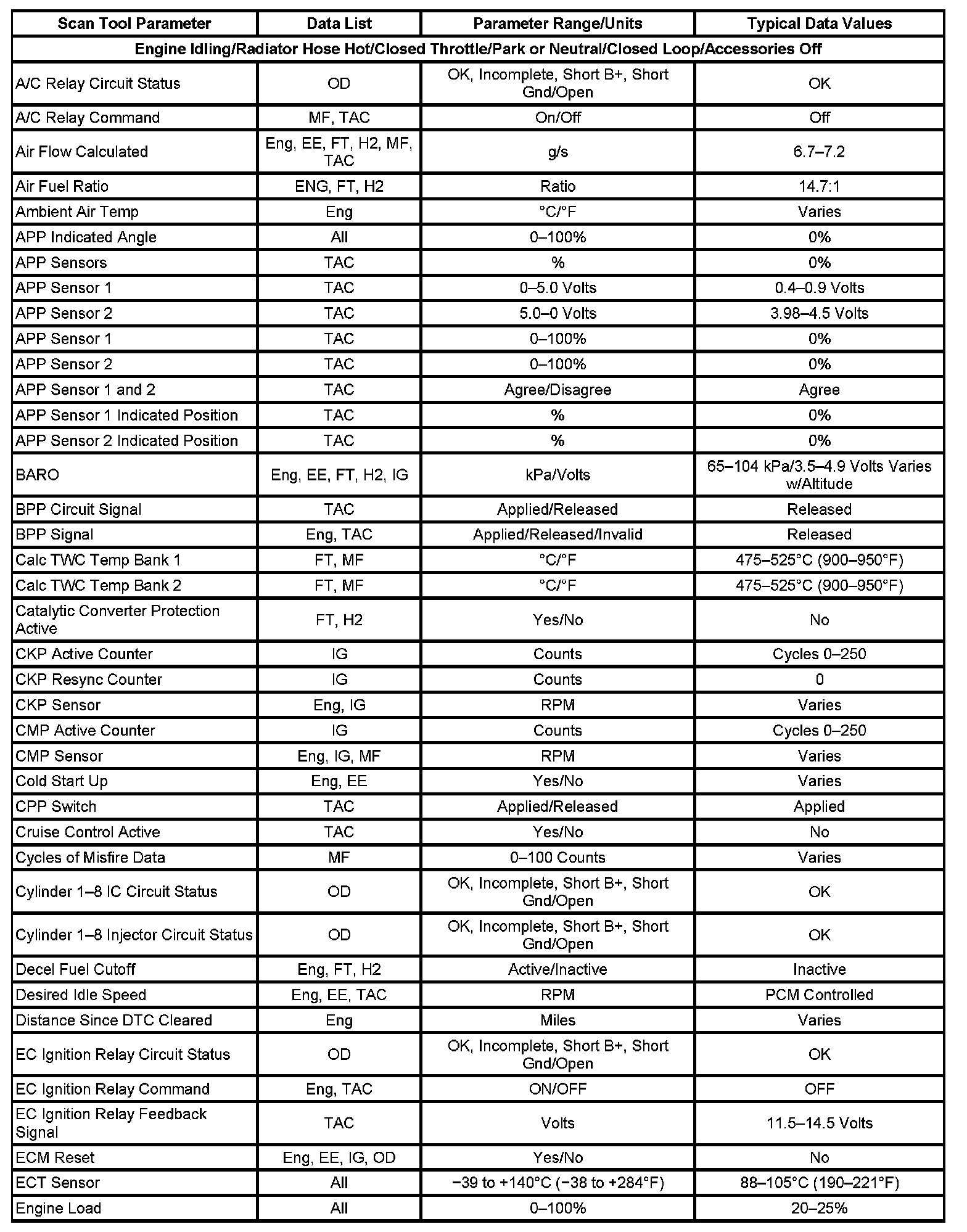 The column labeled Data List indicates where a parameter can be located on the scan tool. Refer to the scan tool operating manual for the exact locations of the data lists. The following is a description of each term listed: