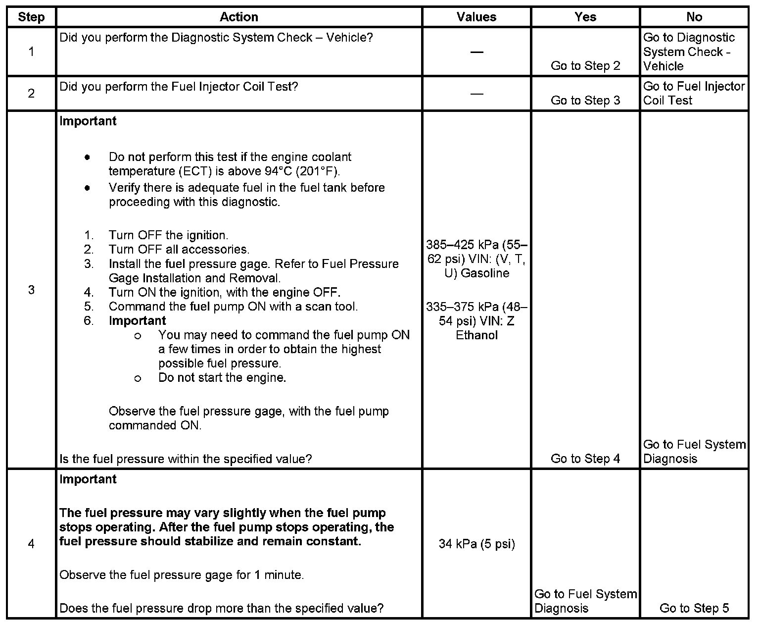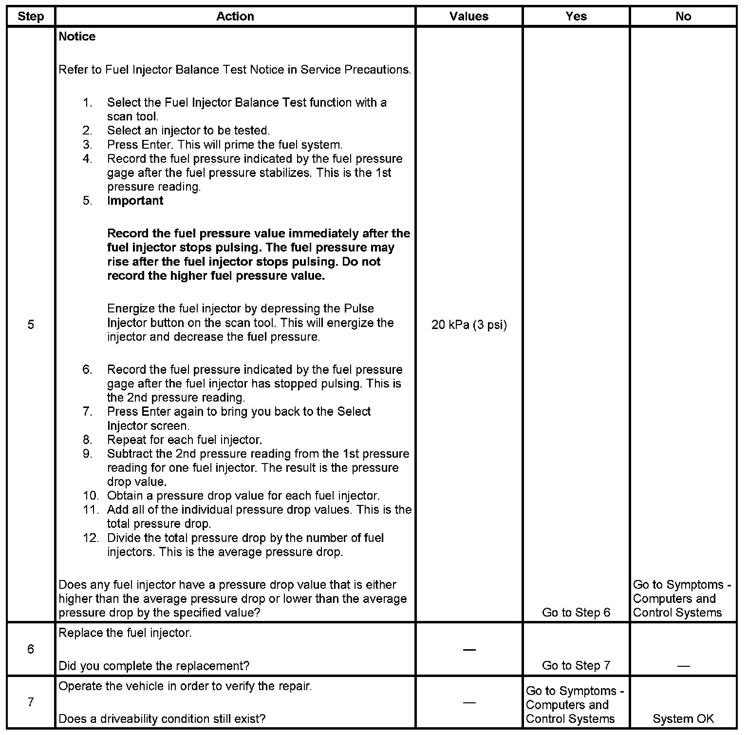 5. If the pressure drop value for each fuel injector is within 10 kPa (1.5 psi) of the average pressure drop value, the fuel injectors are flowing properly. Calculate the pressure drop value for each fuel injector by subtracting the second pressure reading from the first pressure reading.