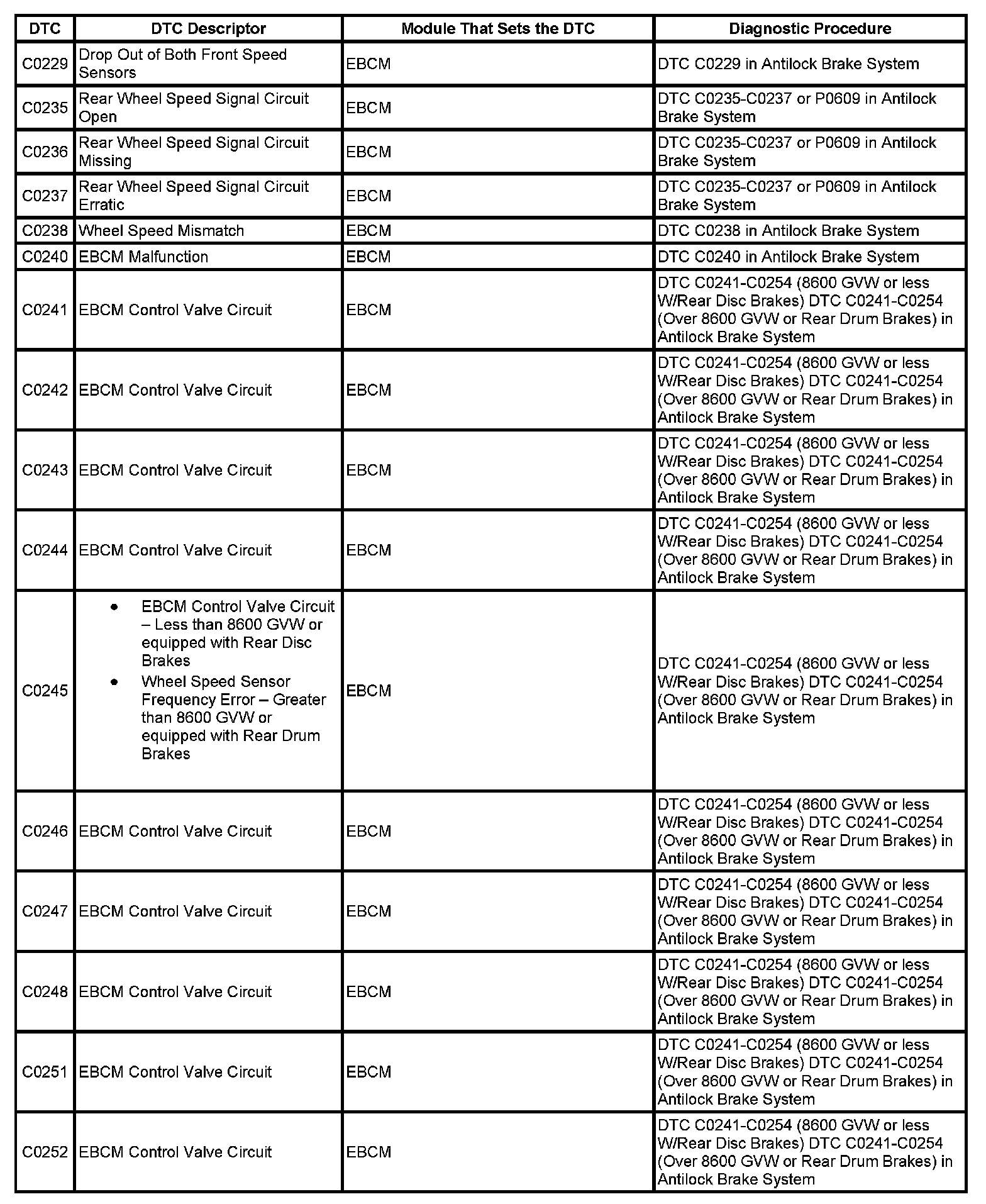 DTC's C0229-C0252: