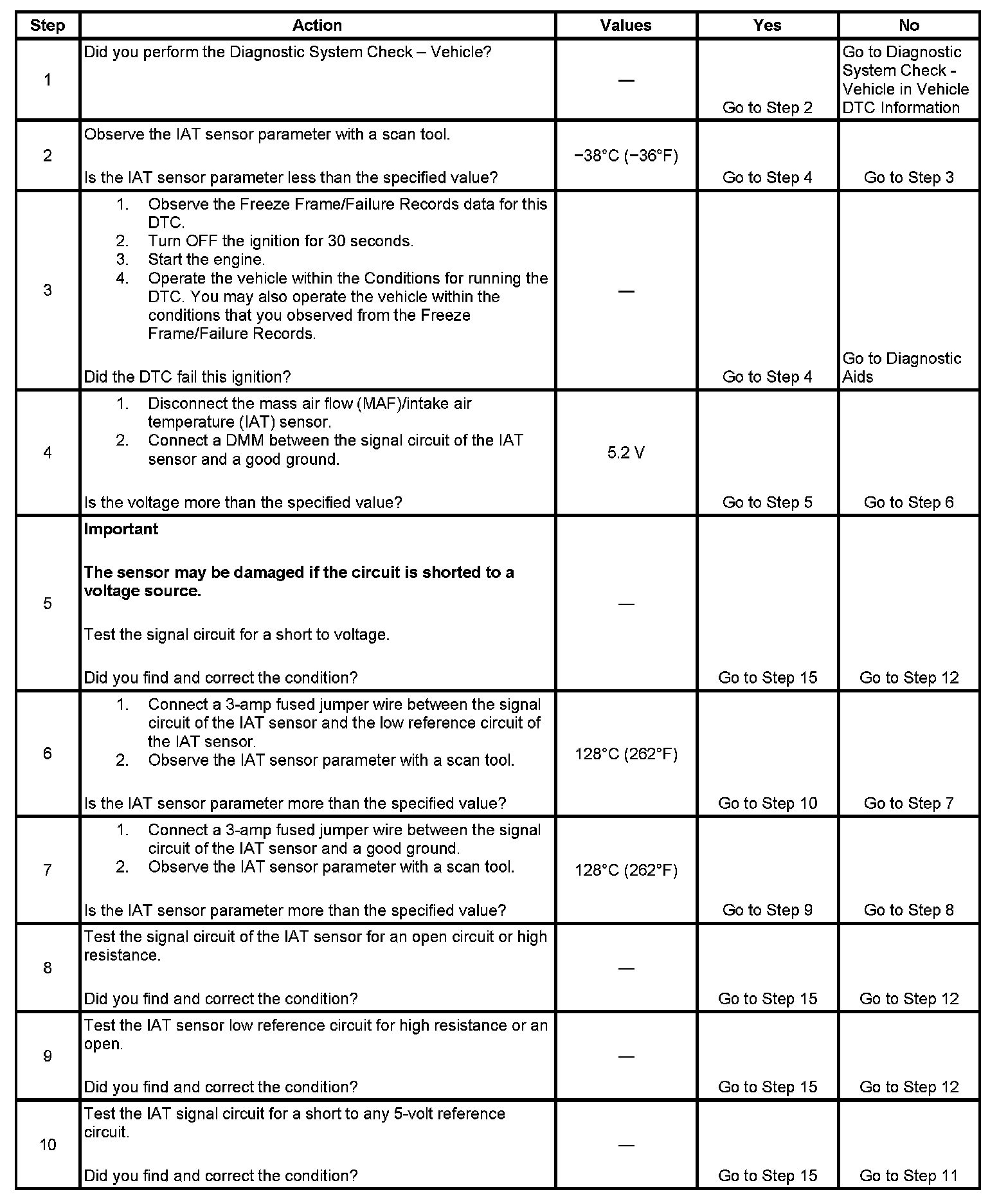 The PCM detects that the IAT Sensor parameter is less than -38°C (-36°F) for more than 12.5 seconds.