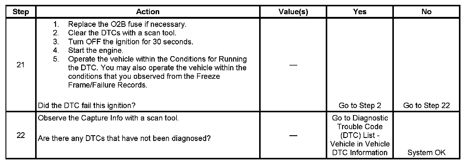 The heated oxygen sensor (HO2S) must reach operating temperature to provide an accurate voltage signal. A heating element inside the HO2S minimizes the time required for the sensor to reach operating temperature. Voltage is provided to the heater by the ignition 1 voltage circuit through a fuse. With the engine running, ground is provided to the heater by the HO2S heater low control circuit, through a low side driver within the powertrain control module (PCM). The PCM commands the heater ON or OFF to maintain a specific HO2S operating temperature range. The PCM determines the temperature by measuring the current flow through the heater. When the heater is in the ON state, the PCM will pulse the heater OFF for a duration of 50 ms, once per second. When the heater is in the OFF state, the PCM will pulse the heater ON for a duration of 50 ms, once per second. The PCM monitors the heater current with the engine running. This diagnostic will only run once per ignition cycle. If the PCM detects that the heater current is not within an expected range, DTC P0141 sets for HO2S bank 1 sensor 2, or DTC P0161 sets for HO2S bank 2 sensor 2.