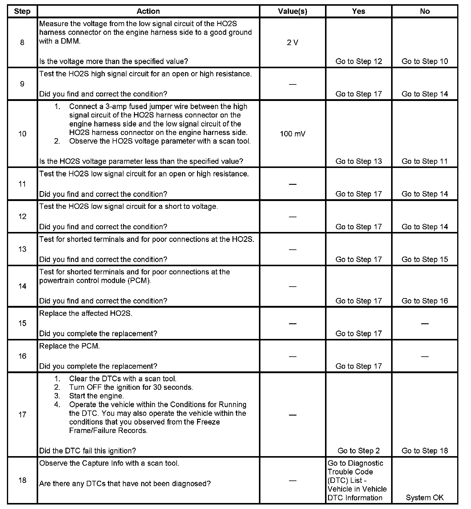 Heated oxygen sensors (HO2S) are used for fuel control and post catalyst monitoring. Each HO2S compares the oxygen content of the surrounding air with the oxygen content in the exhaust stream. The HO2S must reach operating temperature to provide an accurate voltage signal. Heating elements inside the HO2S minimize the time required for the sensors to reach operating temperature. The powertrain control module (PCM) supplies the HO2S with a reference, or bias, voltage of about 450 mV. When the engine is first started, the PCM operates in Open Loop, ignoring the HO2S voltage signal. Once the HO2S reaches operating temperature and Closed Loop is achieved, the HO2S generates a voltage within a range of 0-1,000 mV that fluctuates above and below bias voltage. High HO2S voltage indicates a rich exhaust stream. Low HO2S voltage indicates a lean exhaust stream. If the PCM detects that the HO2S voltage remains within the bias voltage range, DTC P0134 sets for HO2S bank 1 sensor 1 or DTC P0154 sets for HO2S bank 2 sensor 1.