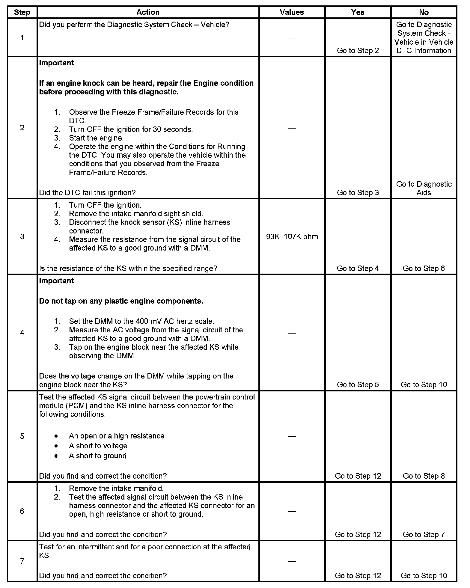The knock sensors (KS) produce an AC signal under all engine operating conditions. When the engine is running, the powertrain control module (PCM) learns a minimum and maximum frequency of normal engine noise. The KS system monitors both knock sensors in order to determine if knock is present. If the KS system determines that excessive knock is present, the PCM retards the spark timing based on the signals from the KS. The PCM continues to retard timing until no knock is present. If the PCM detects that the frequency is out of the normal range, DTC P0327 or P0332 will set.