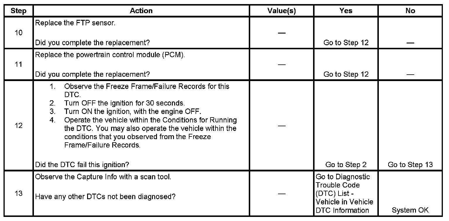 The fuel tank pressure (FTP) sensor measures the difference between the air pressure or vacuum in the evaporative emission (EVAP) system, and the outside air pressure. The control module supplies a 5-volt reference and a low reference circuit to the FTP sensor. The FTP sensor signal circuit voltage varies depending on EVAP system pressure or vacuum. If the FTP sensor signal voltage goes below a calibrated value, this DTC sets.