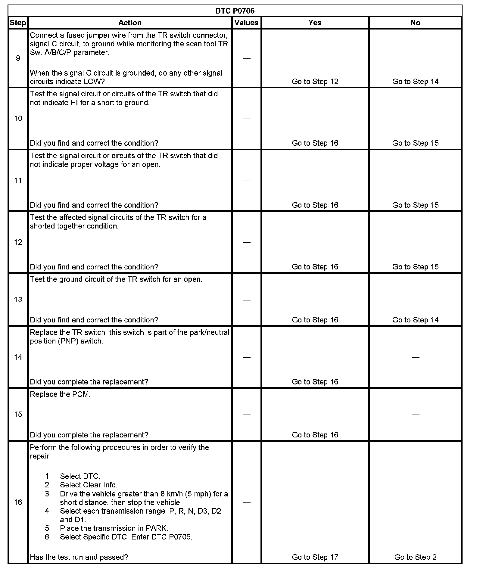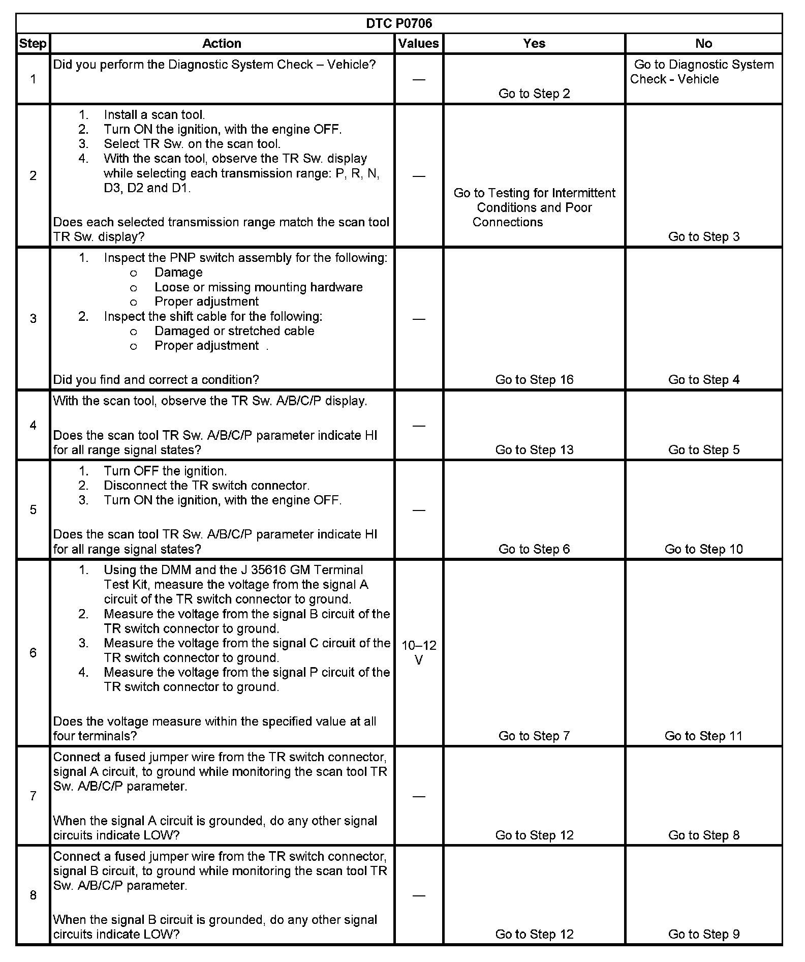 DTC P0706 will set if the PCM detects start-up in a drive range or vehicle speed in the PARK or NEUTRAL range. DTC P0706 is a type C DTC.
