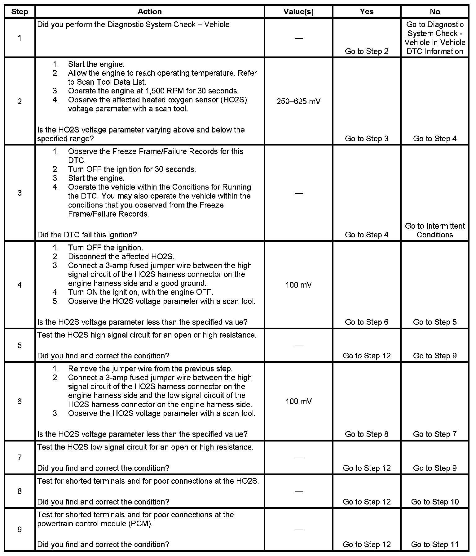 Heated oxygen sensors (HO2S) are used for fuel control and post catalyst monitoring. Each HO2S compares the oxygen content of the surrounding air with the oxygen content in the exhaust stream. The HO2S must reach operating temperature to provide an accurate voltage signal. Heating elements inside the HO2S minimize the time required for the sensors to reach operating temperature. The powertrain control module (PCM) supplies the HO2S with a reference, or bias, voltage of about 450 mV. When the engine is first started the PCM operates in open loop, ignoring the HO2S voltage signal. Once the HO2S reaches operating temperature and closed loop is achieved, the HO2S generates a voltage within a range of 0-1,000 mV that fluctuates above and below bias voltage. High HO2S voltage indicates a rich exhaust stream; low HO2S voltage indicates a lean exhaust stream. This diagnostic will only run once per ignition cycle. The PCM monitors the rich-to-lean and lean-to-rich transition time. A transition is defined as, the HO2S voltage changes from greater than 625 mV to less than 250 mV or from less than 250 mV to greater than 625 mV. If the PCM detects that the difference between the rich-to-lean average transition time and lean-to-rich average transition time is greater than a specified value, DTC P1134 sets for HO2S bank 1 sensor 1, or DTC P1154 sets for HO2S bank 2 sensor 1.