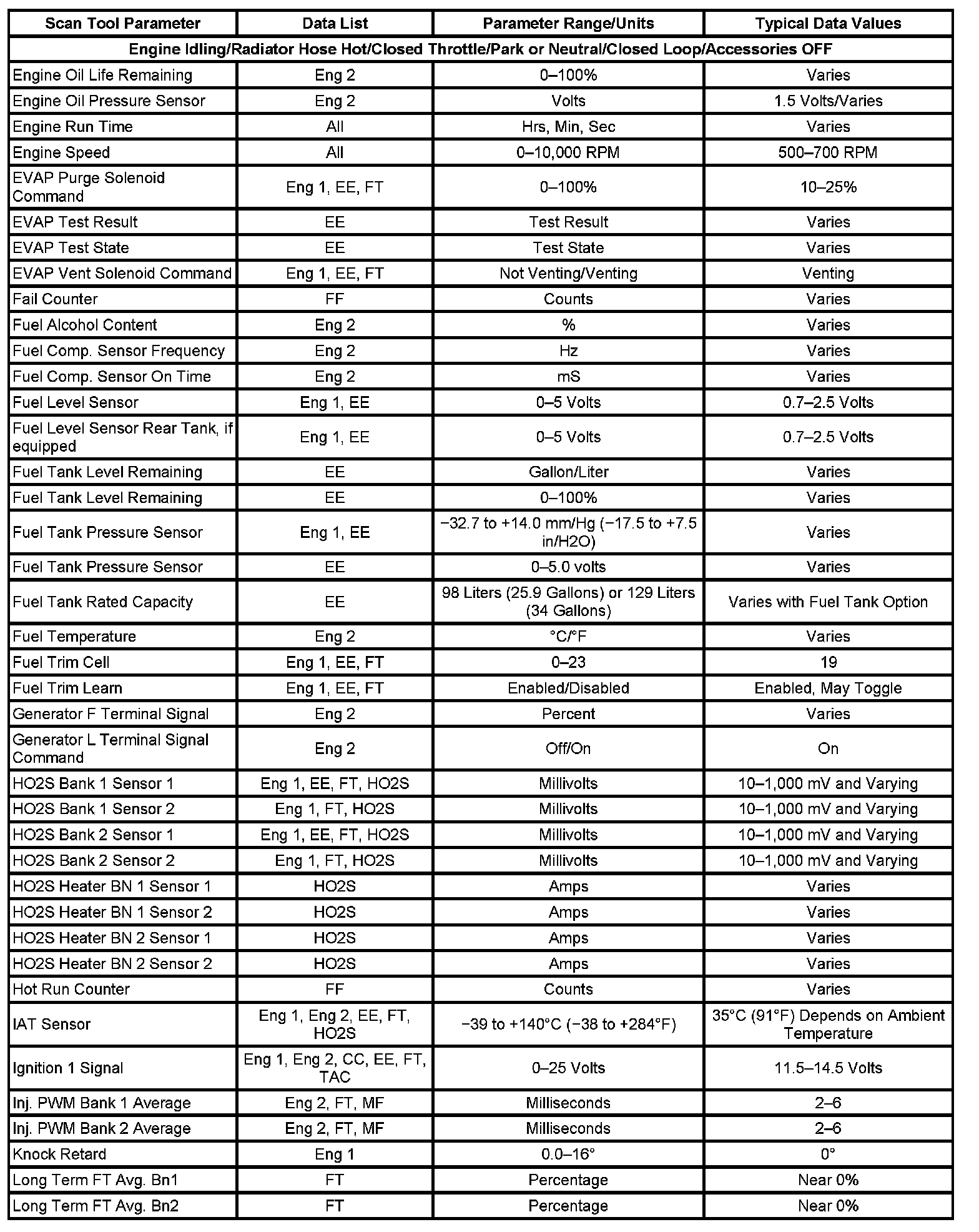 The Engine Scan Tool Data List contains all engine related parameters that are available on the scan tool. The list is arranged in alphabetical order. A given parameter may appear in any one of the data lists, and in some cases may appear more than once, or in more than one data list in order to group certain related parameters together.