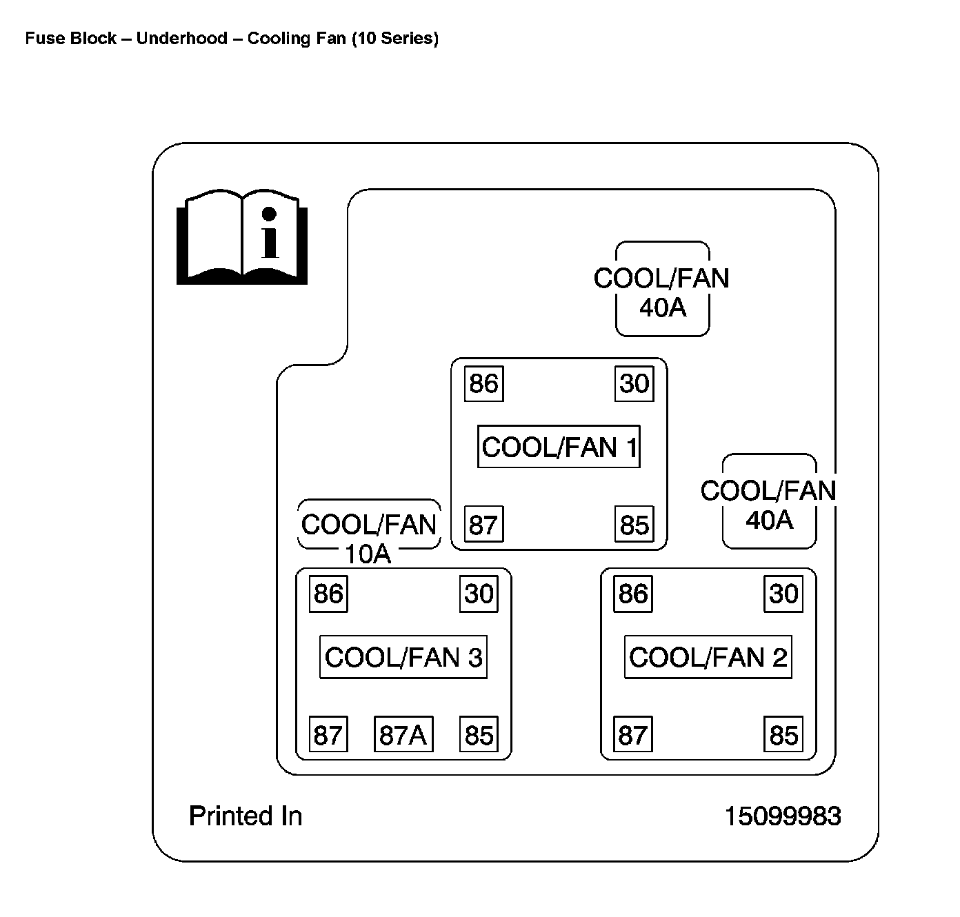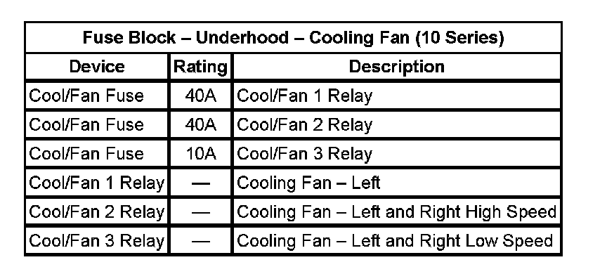 The Cooling Fan 1, Cooling Fan 2, Cooling Fan 3, relays are located in the Fuse Block - Underhood - Cooling Fan (10 Series).