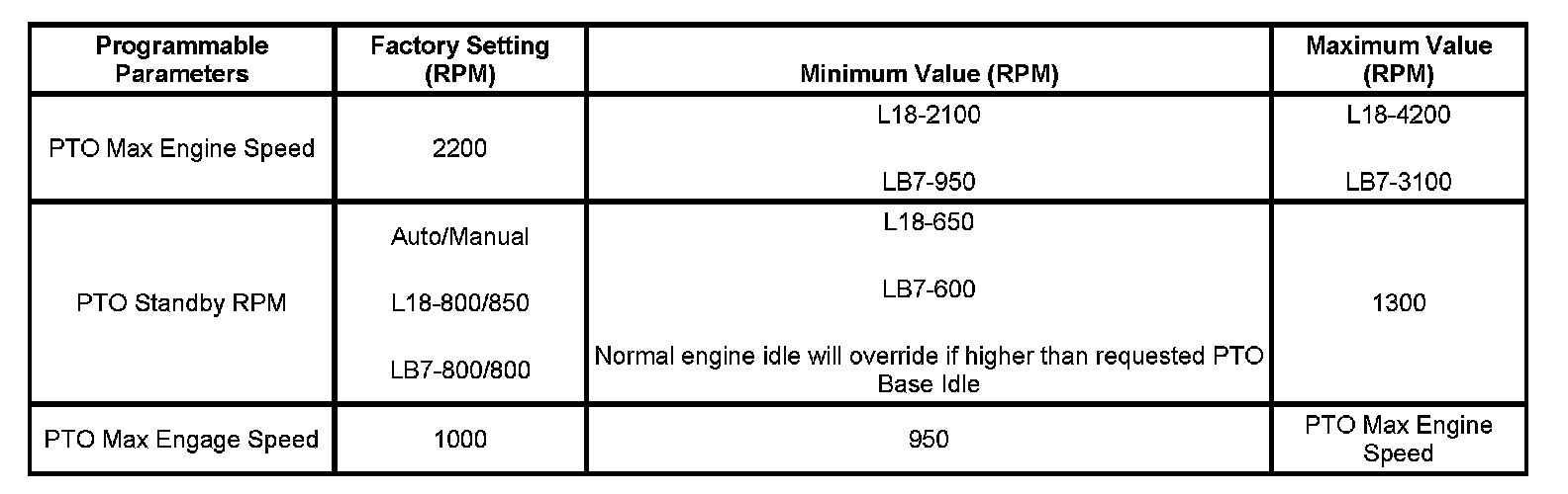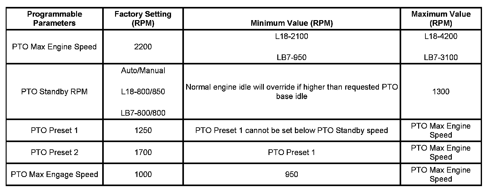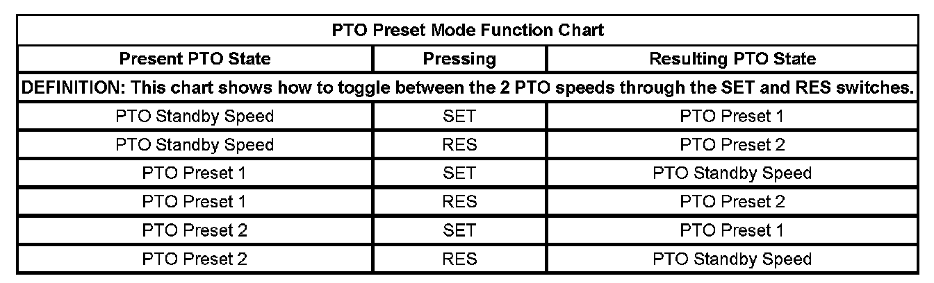 The PTO preset mode is used for stationary applications. PTO will remain engaged while mobile in the preset mode however PTO Preset 1 and PTO Preset 2 speed controls will be inoperative. The engine RPM will also return to normal. This mode provides a default standby speed of 800 or 850 RPM depending on the engine and transmission combination. This mode also provides 2 default PTO control speeds: PTO Preset 1 of 1250 RPM and PTO Preset 2 of 1700 RPM. Please note that the standby speed is not to be used as a PTO control speed. Vehicles not equipped with cruise control will not have the resume speed capability.