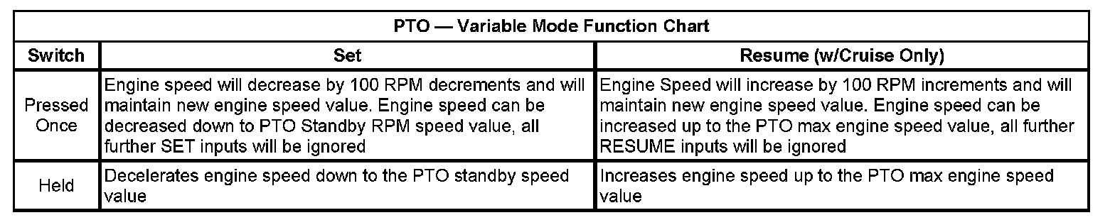 The PTO speed control mode is used for both stationary and mobile applications. This mode allows PTO to be controlled in a fashion similar to cruise control. The operator is able to hold an engine RPM between 800 and 2200 with the SET switch on the cruise stock or the PTO switch. The operator can "tap up" to increase engine speed in 100 RPM increments with the RESUME switch. The operator may also "tap down" to decrease engine speed with either SET switch on the cruise control multifunction switch or the PTO switch. Vehicles not equipped with cruise control will not have the "tap up" capability.