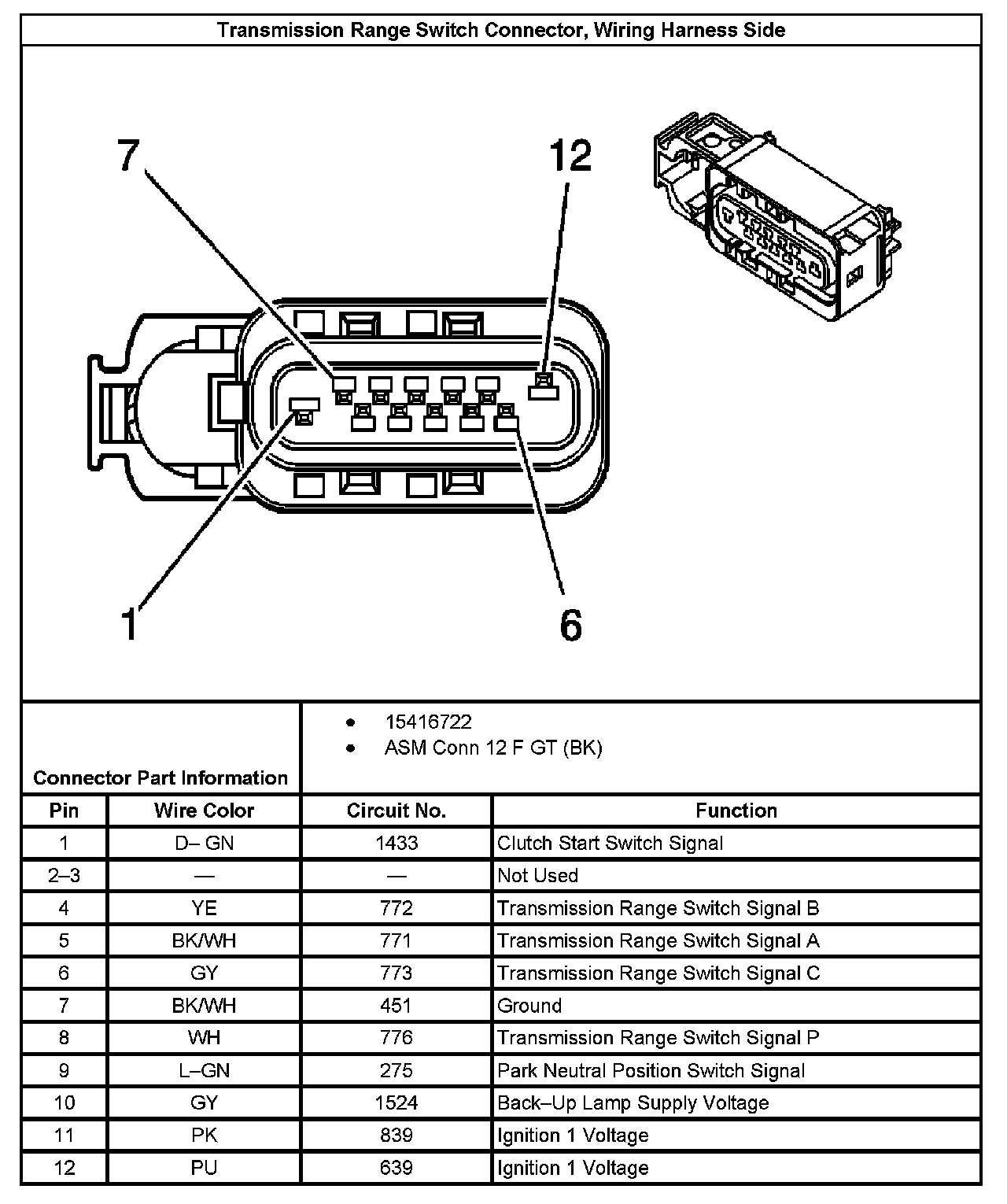 Transmission Range Switch Connector, Wiring Harness Side: